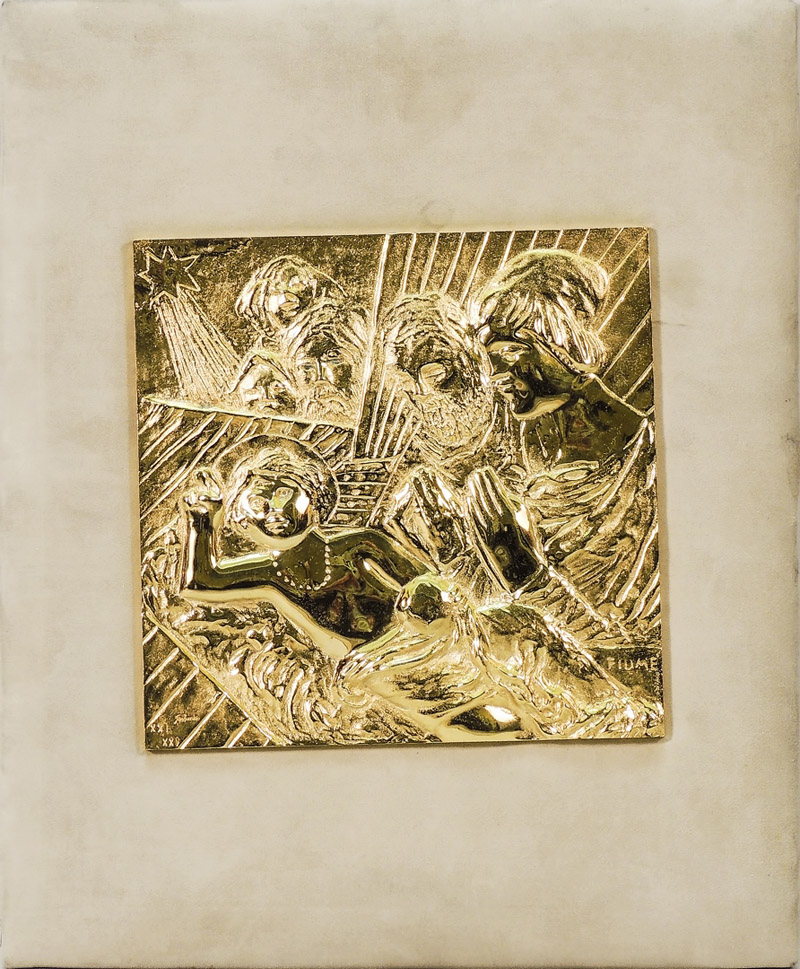 SALVATORE FIUME (1915-1997) Natività - Nativity bassorilievo in bronzo dorato - gilded bronze low-relief, es XXI/XXV, firmato cm 30x29 Reca timbro San Zanobi - With stamp