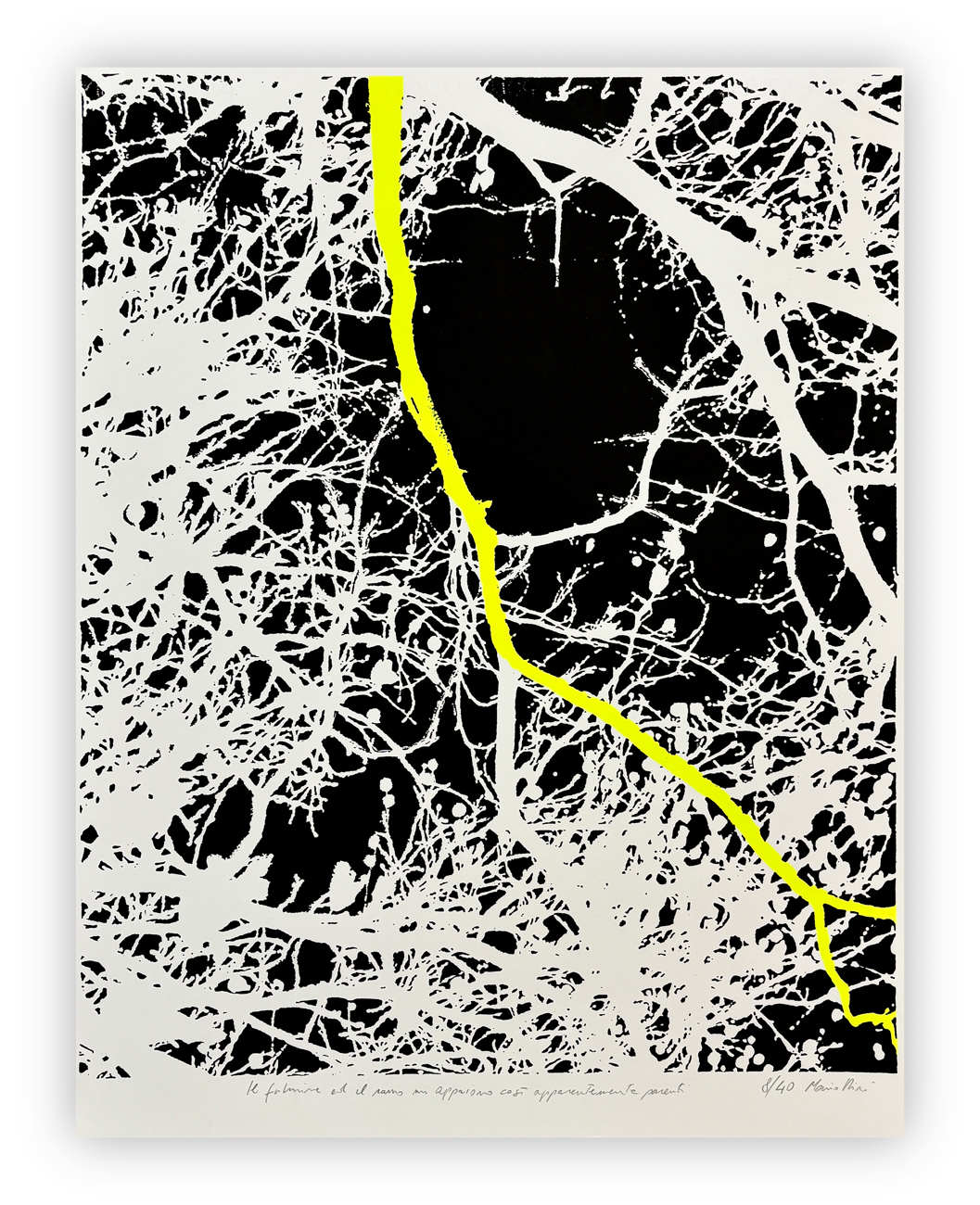 Serigrafia retouchè (con intervento a mano di evidenziatore giallo) su carta Fabriano 50% cotone