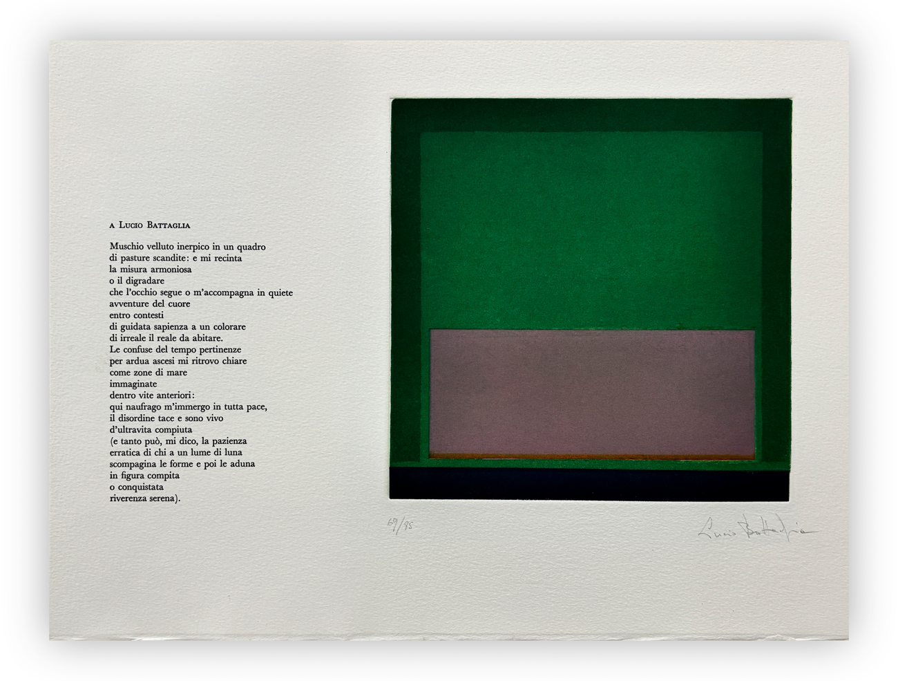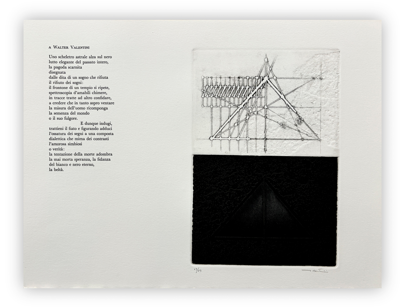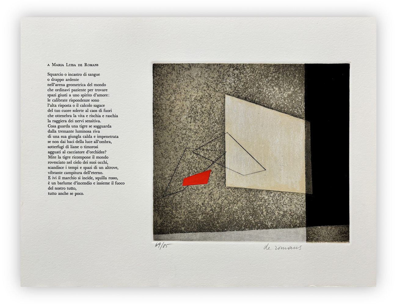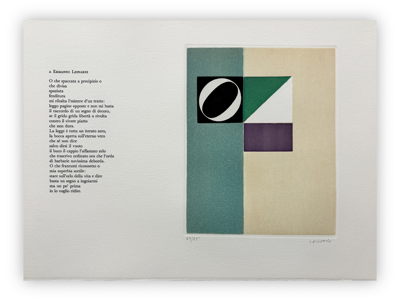 Elegante cartella contenente poesie di Grytzko Mascioni e 4 incisioni all'acquaforte e acquatinta di Lucio Battaglia, Maria Luisa De Romans, Ermanno Leinardi e Walter Valentini, ciascuna recante firma degli Artisti e numerazione (Esemplari 69/85) a matita al fronte