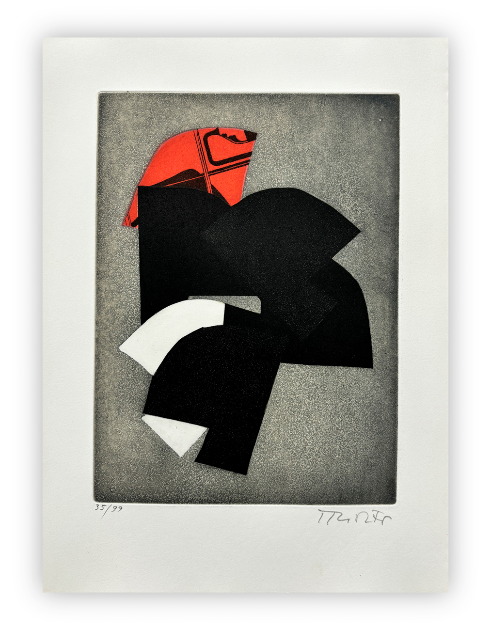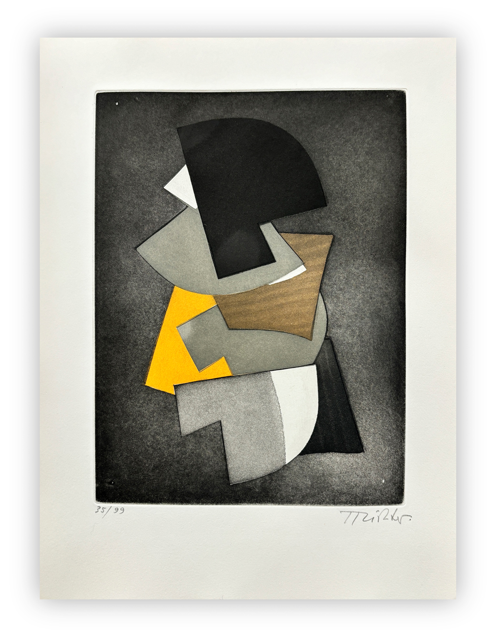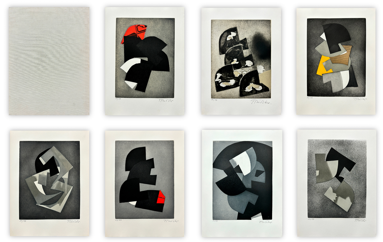 Splendida cartella contenente poesie di Gui Rosey illustrate da 7 incisioni all'acquaforte di Hans Richter, ciascuna recante firma e numerazione (Esemplari 35/99) a matita al fronte