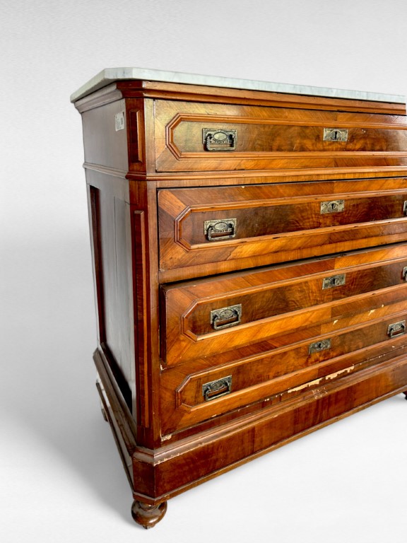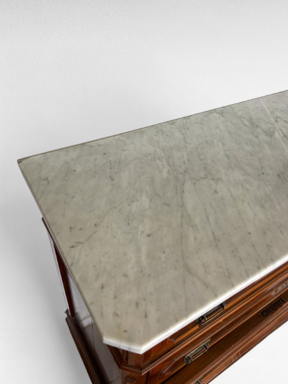 piano in marmo bianco, fronte a quattro cassetti, piedi a cipolli