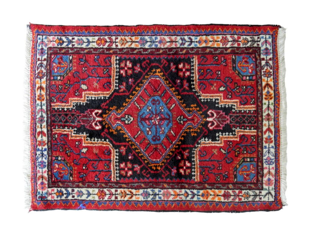 Piccolo tappeto di gusto caucasico a fondo rosso
