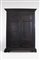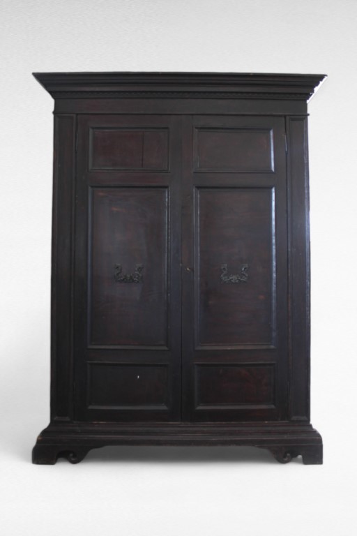 in stile seicentesco, manifattura italiana, a due ante pannellate sormontate da cappello aggentante intagliato a motivo dentellato, piedi a mensola, maniglie a foggia di mascherone sorretto da putti