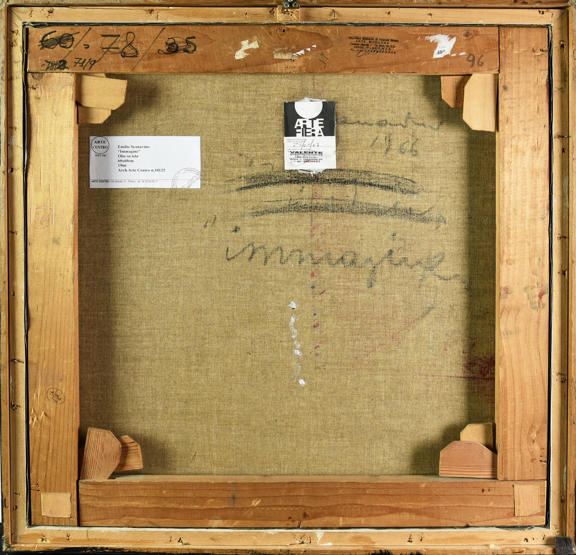 sul retro: firma, titolo, data, timbro Galleria Mazzoni, Piacenza, etichetta e timbro Galleria Arte Centro, Milano, etichetta Artefiera, Bologna e timbro Valente Artecontemporanea, Finale Ligure