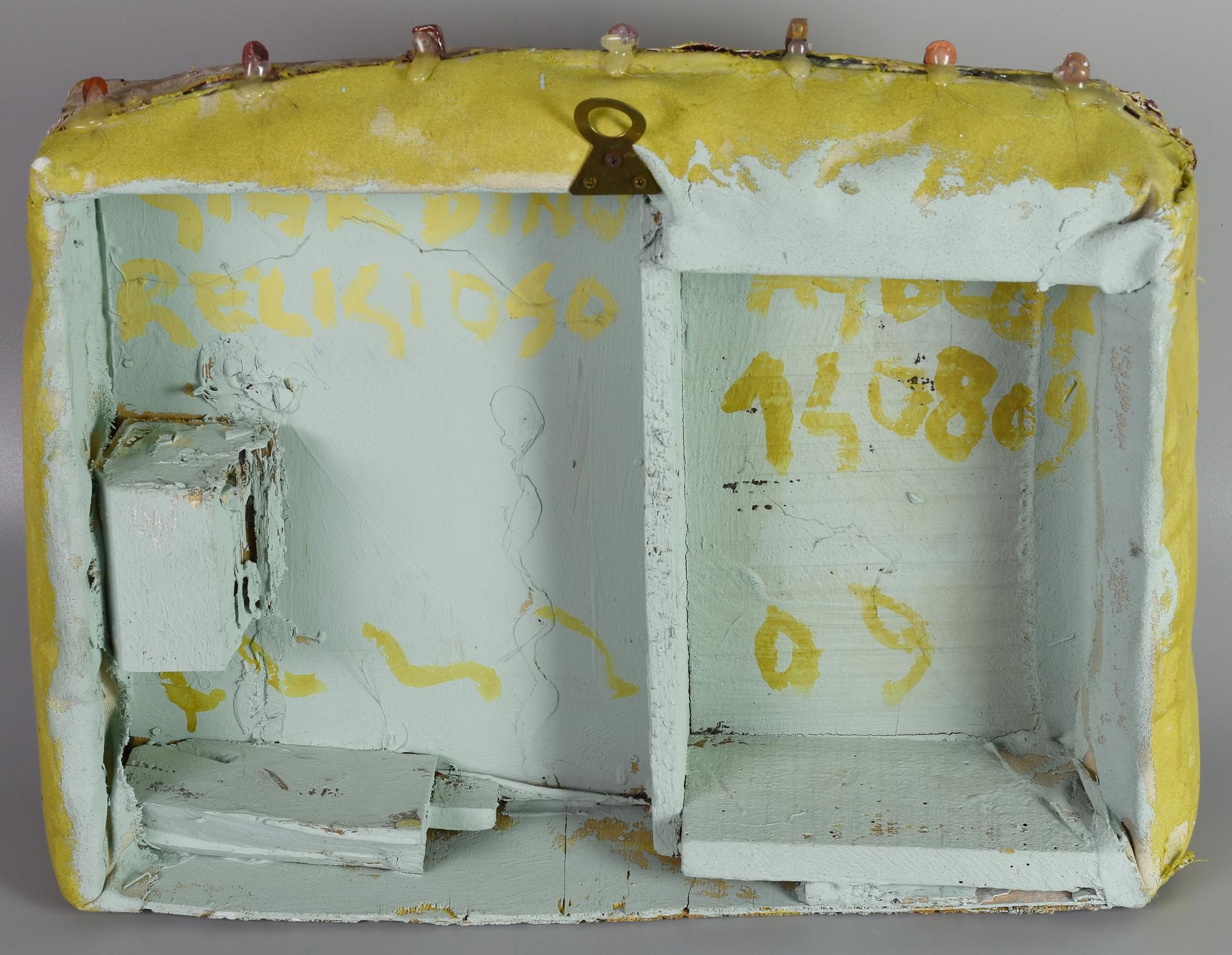 tempera, stoffa, ceramica e cera applicati su legno, cm 37x43x10