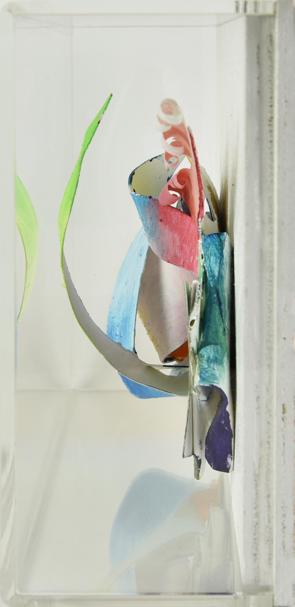 assemblaggio polimaterico su tavola con interventi pittorici, cm 22x37,5x10
