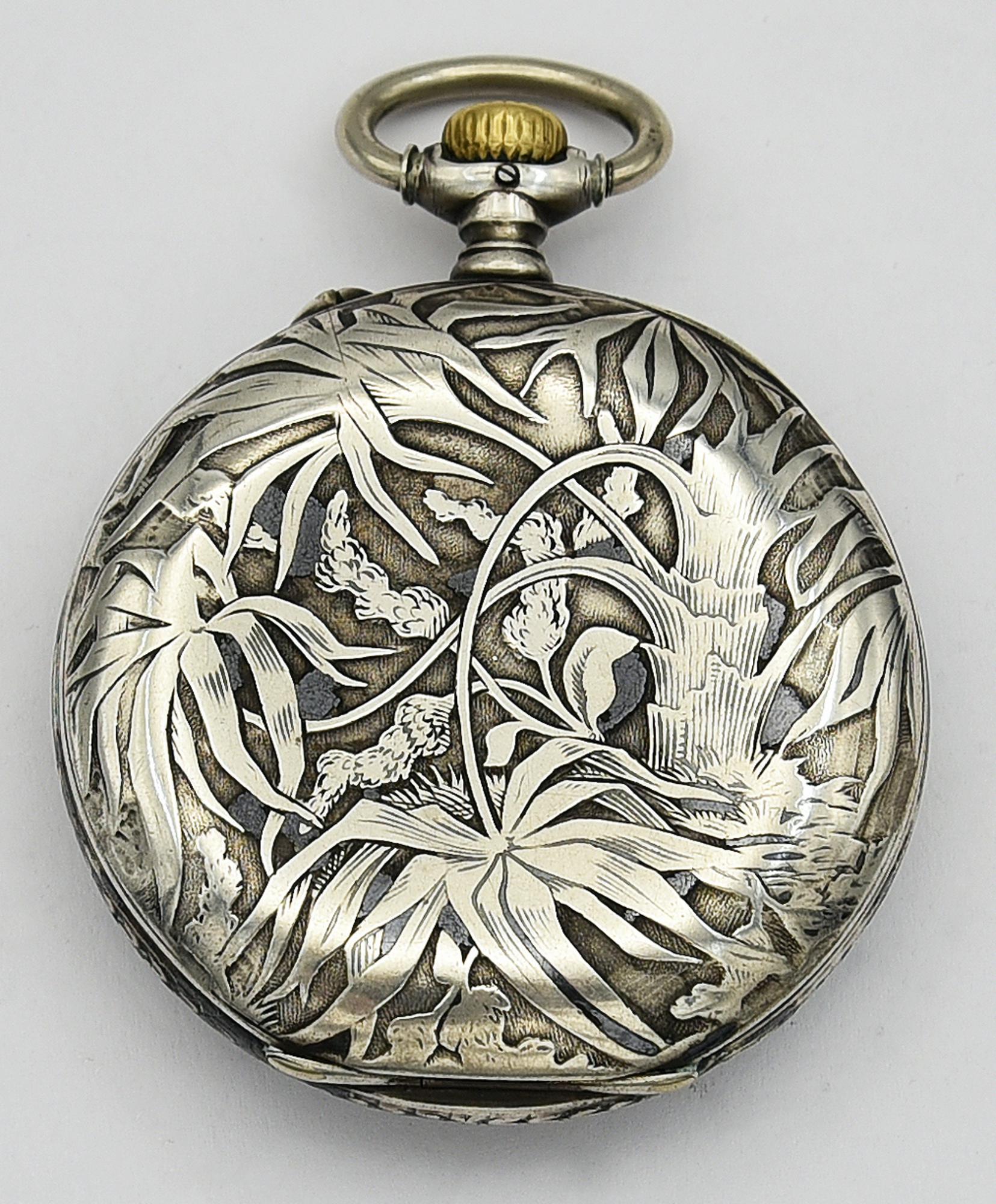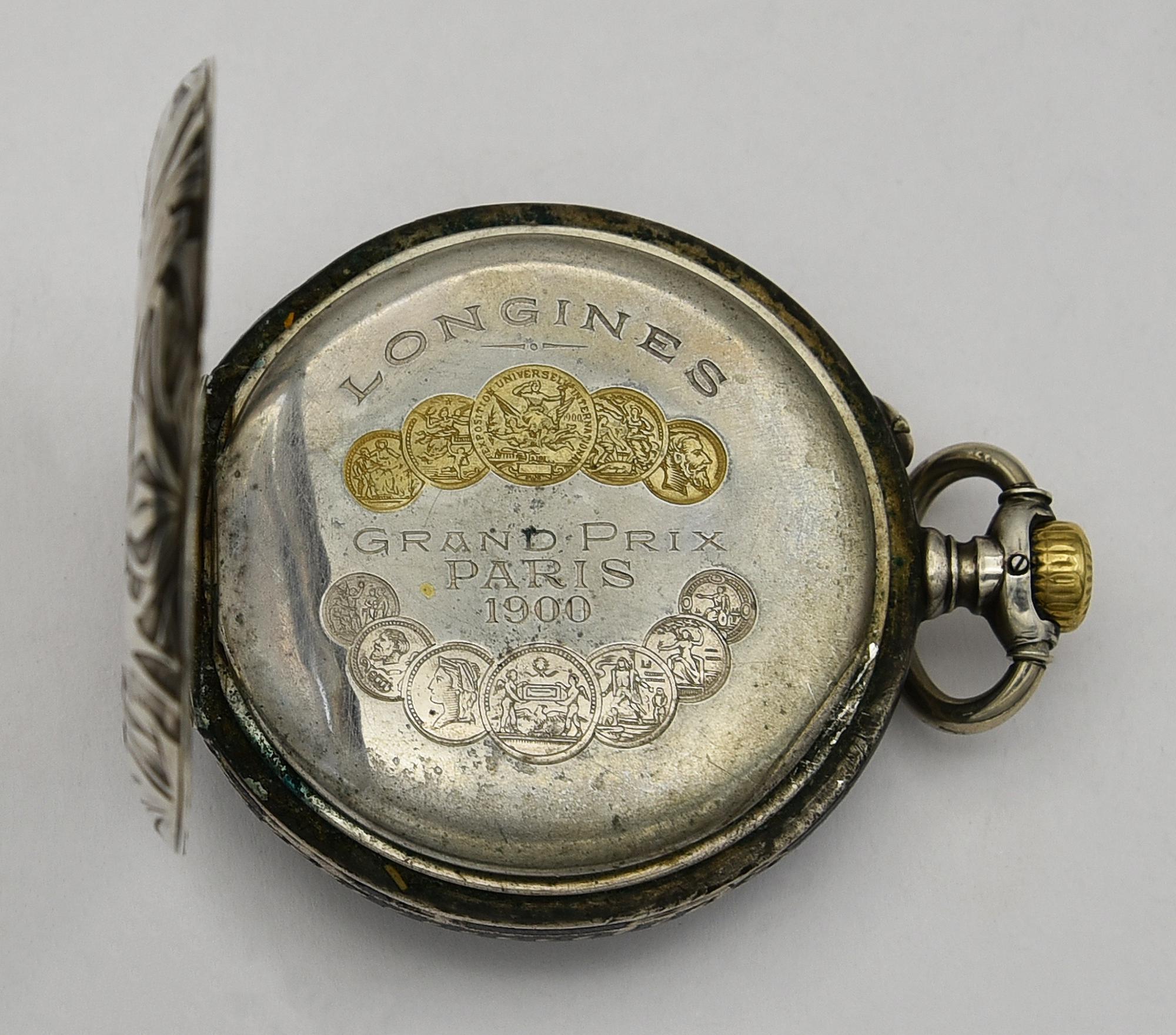 CASSA: in argento lavorata sul retro a sbalzo e incisione; sulla superficie esterna del fondello piu' interno inciso: "LONGINES/GRAND PRIX/PARIS/1900"; referenza, titolo e punzone dell'argento (gallo) visibili sulla superficie interna del fondello piu' interno