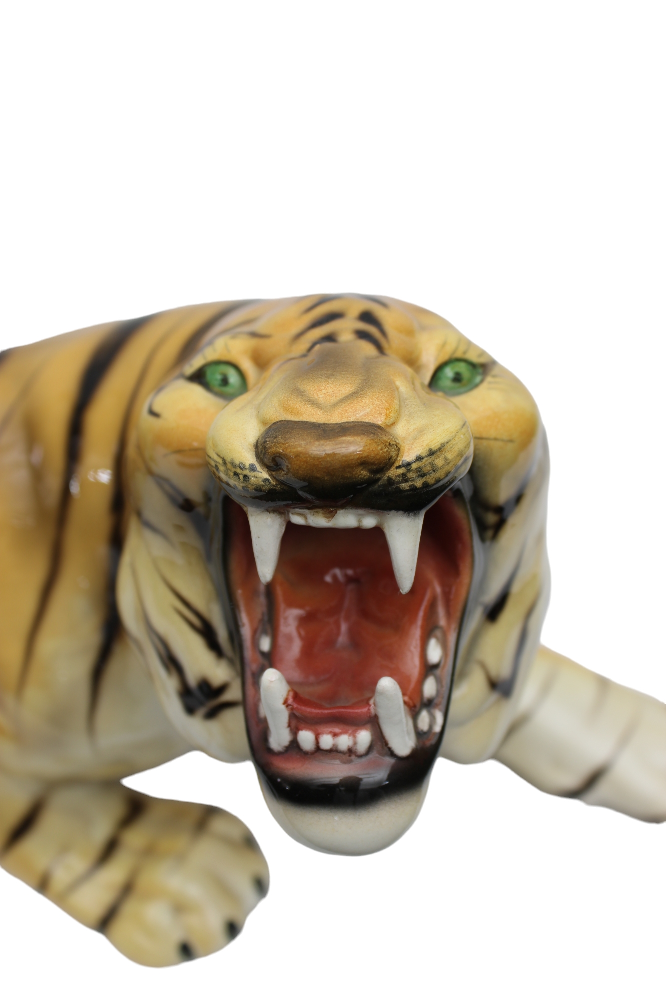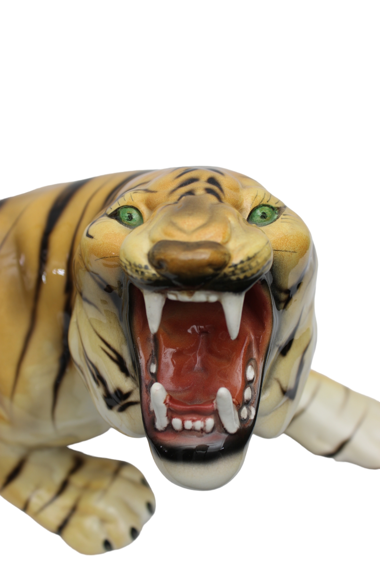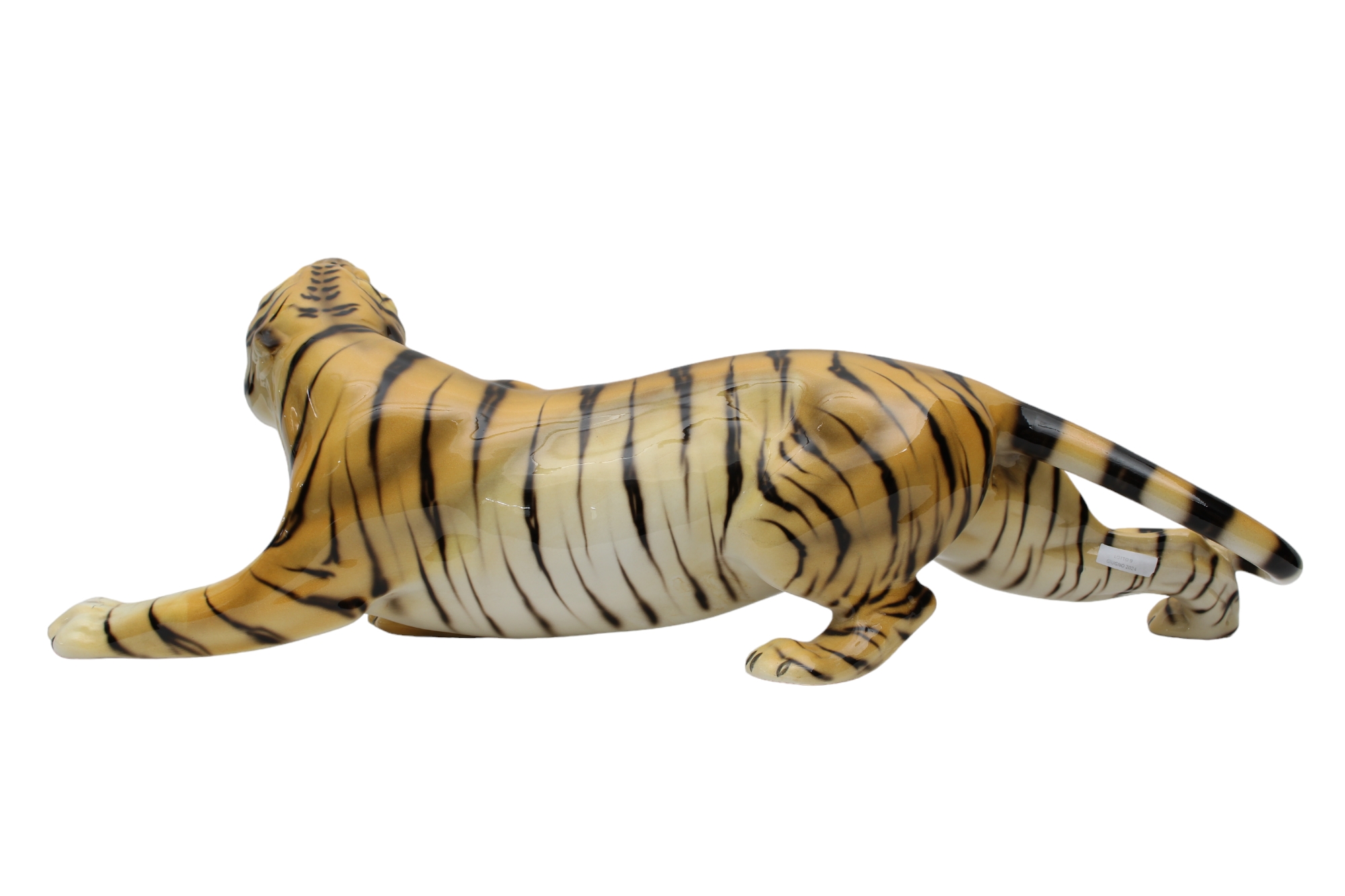 SCULTURA ICONICA in porcellana raffigurante Tigre che ruggisce,produzione italiana design di Ronzan, marchiata sotto la zampa anni 60 h cm 26 x 81 x 24