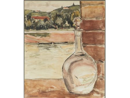 Albano Vitturi (Verona 1888-1968) Bottiglia con paesaggio Acquarello su carta Firmato Misure 36x30 cm