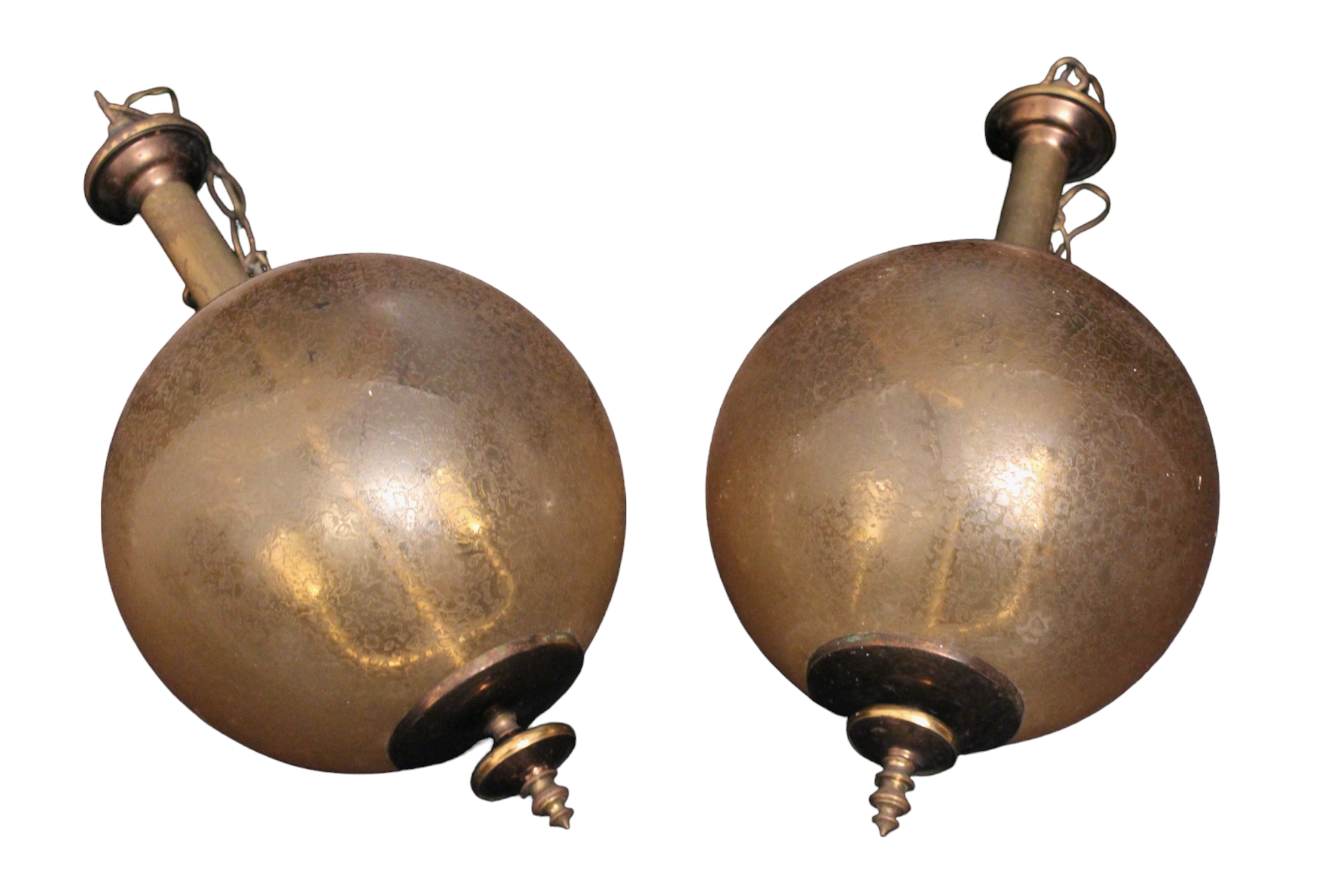 COPPIA DI SOSPENSIONI in ottone rigato con boccia martellata produzione italiana anni 50 h cm 50 x 25