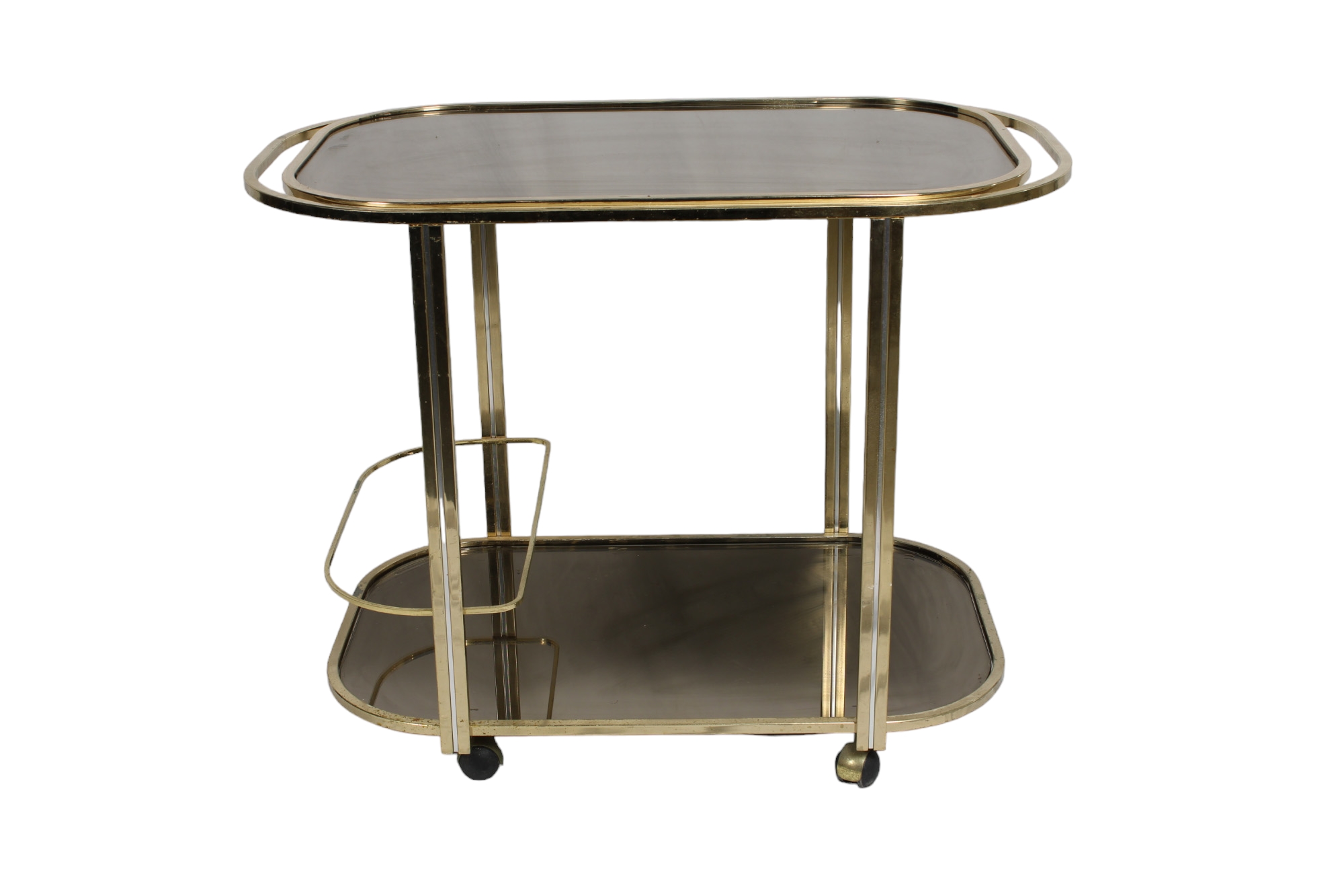 CARRELLO BAR in metallo dorato e piani in vetro fume' produzione italiana anni 80 h cm 68 x 91 x 55