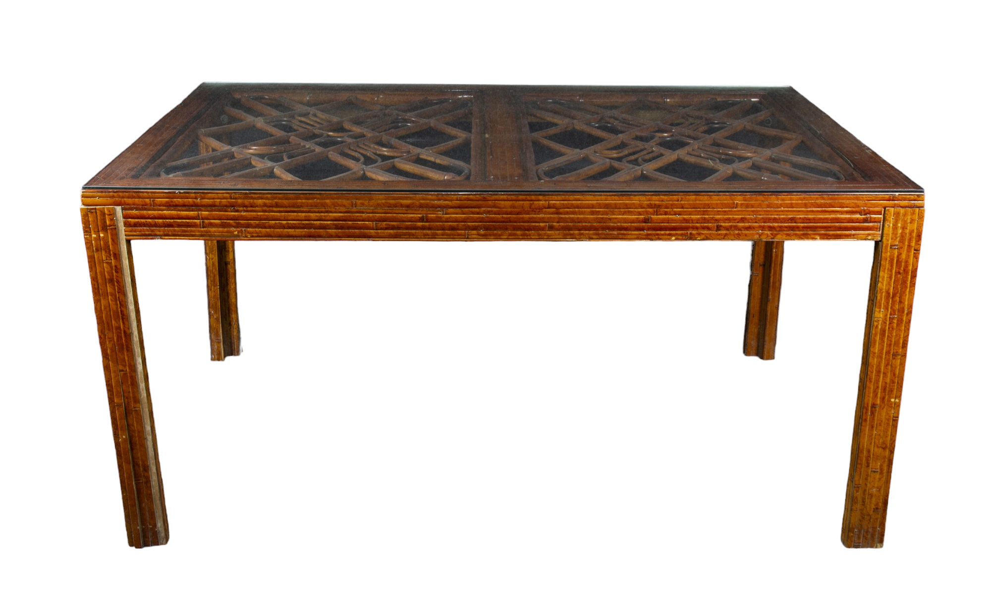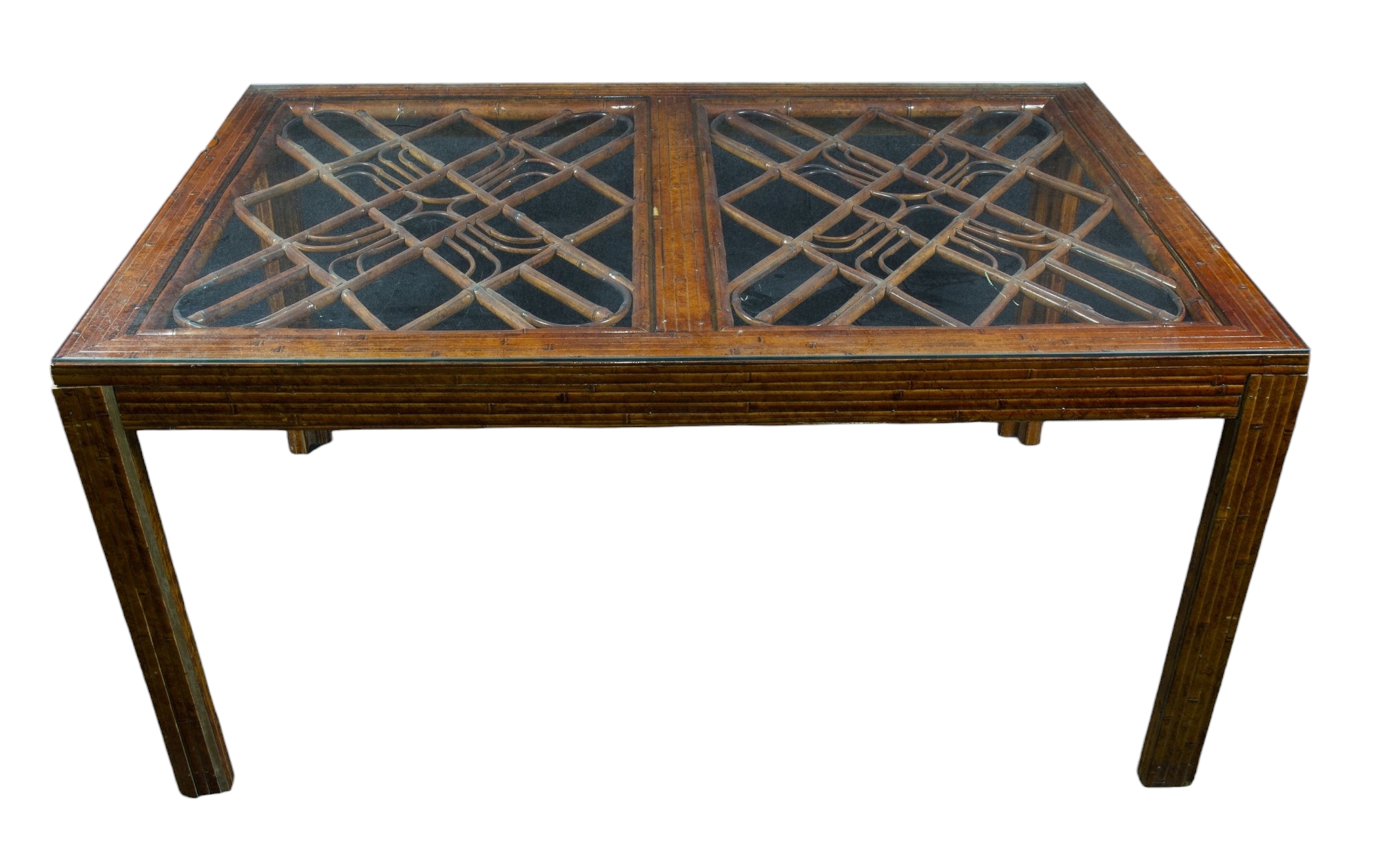 TAVOLO in bambù' con piano in vetro produzione italiana periodo stimato anni 70 (difetti) h cm 75 x 153 x 102