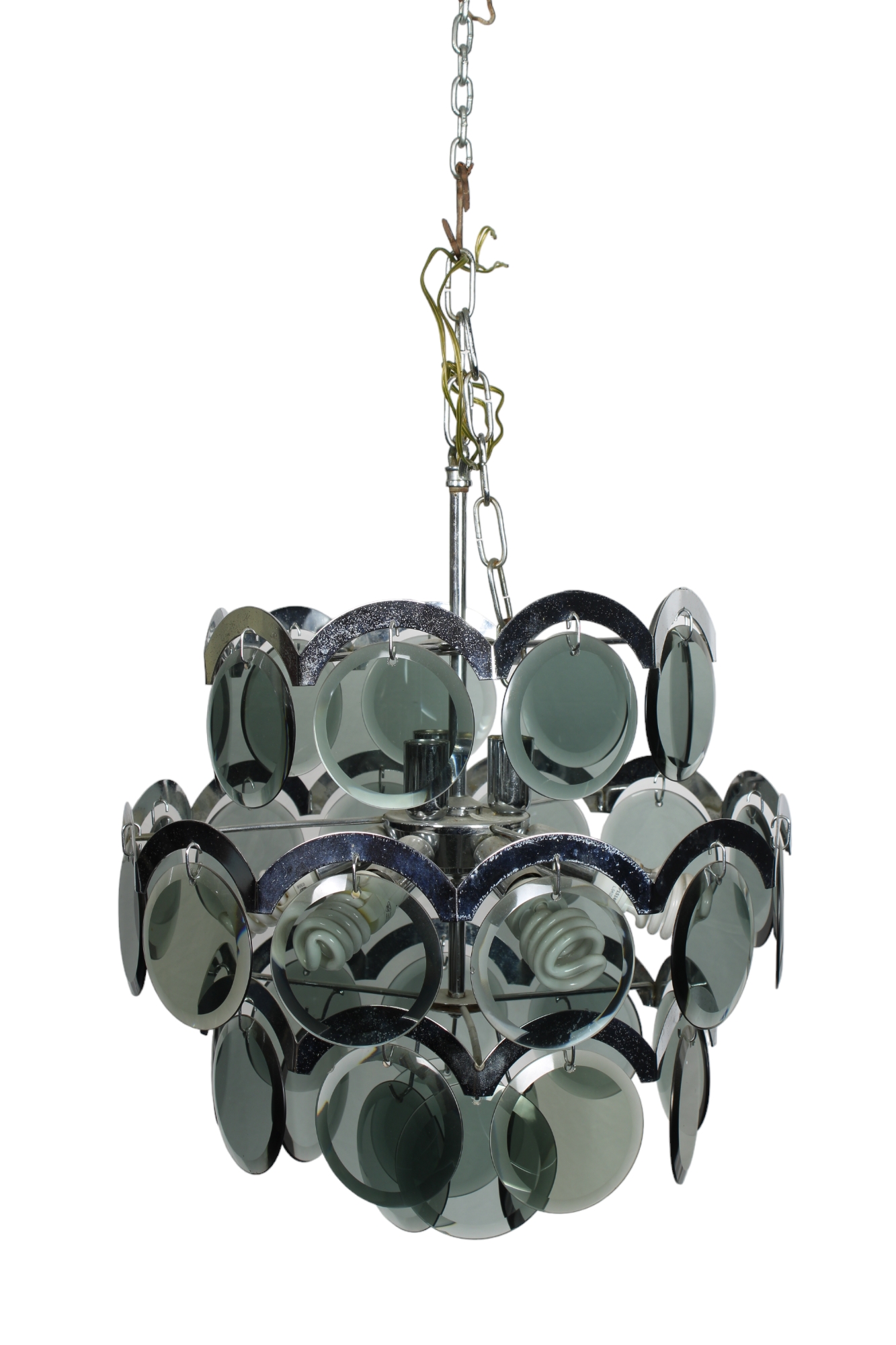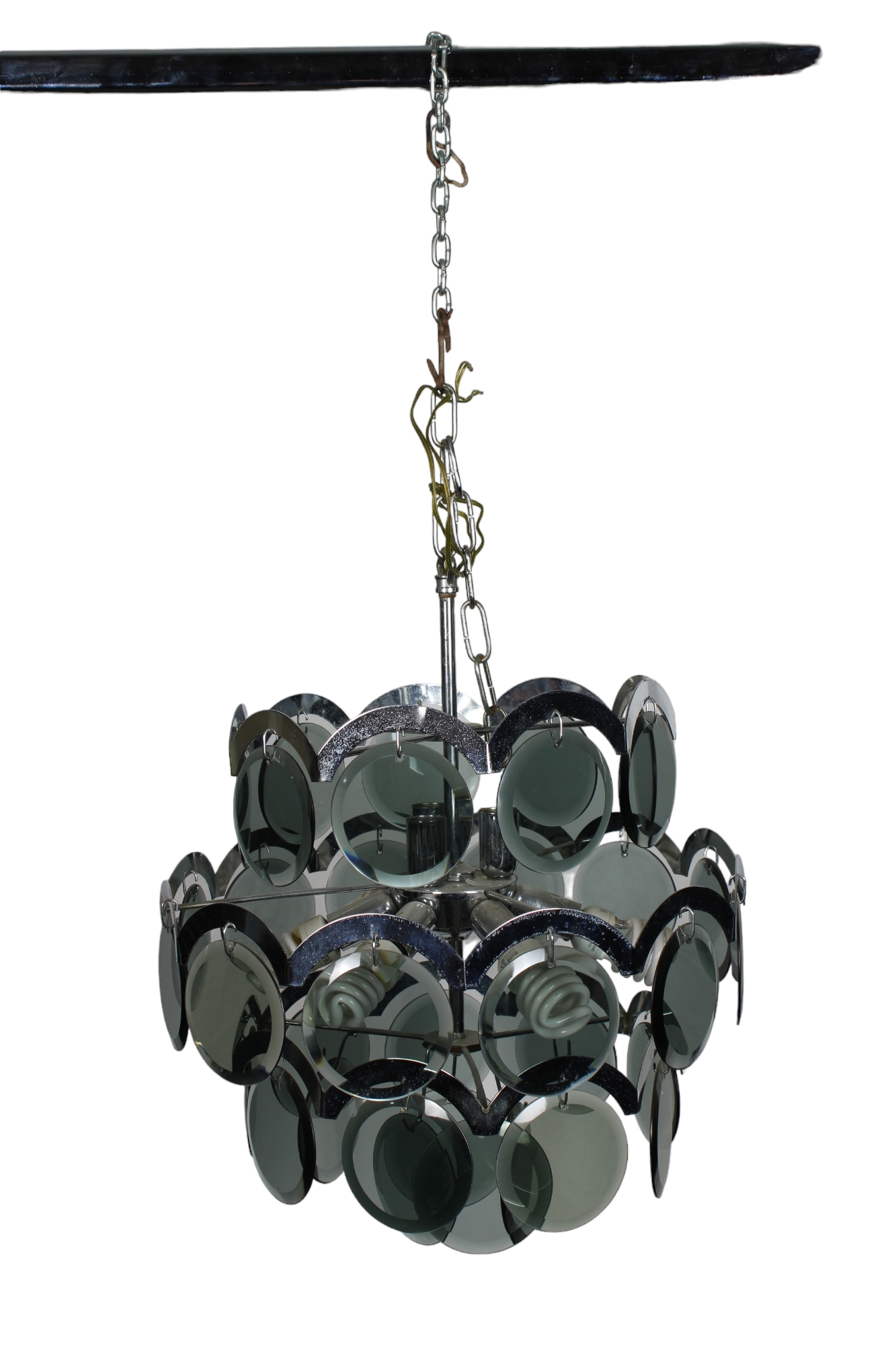 LAMPADARIO ANNI 60 VISTOSI produzione italiana con dischi in vetro fume' e struttura in metallo brunito h cm 95 x Ø 45