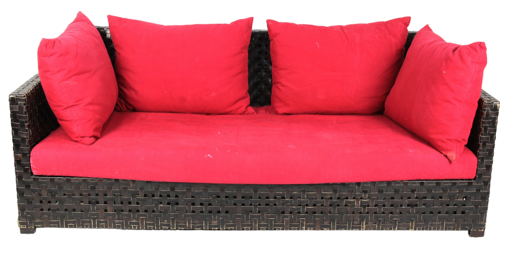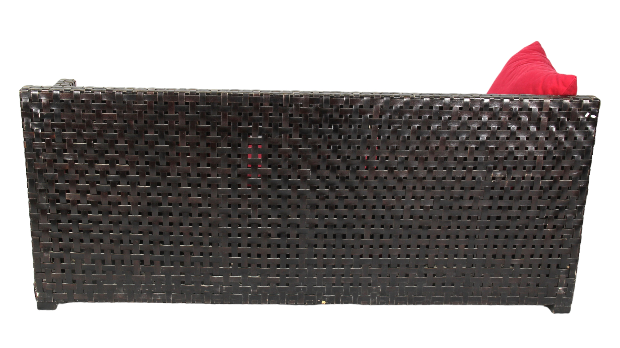 DIVANETTO PER ESTERNO in cuoio intrecciato con cuscini rossi produzione italiana anni 70 h cm 74 x 192 x 84