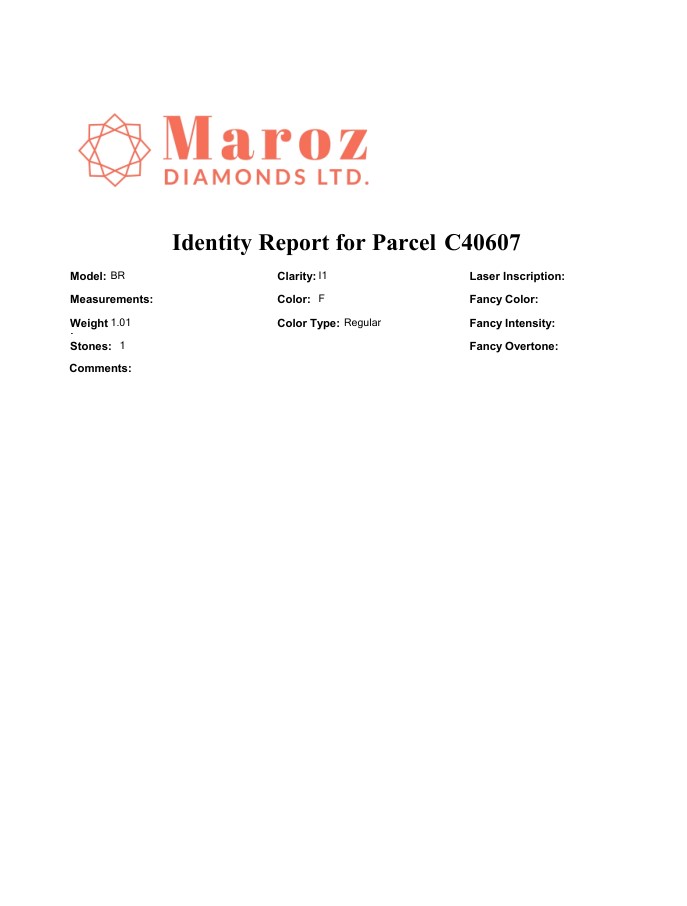 DIAMANTE NATURAL POLISHED 1,01 CARATI COLORE F - PUREZZA I1 - TAGLIO BRILLANTE - CERTIFICATO GEMMOLOGICO MAROZ DIAMONDS LTD MEMBRO ISRAEL DIAMOND EXCHANGE - C40607