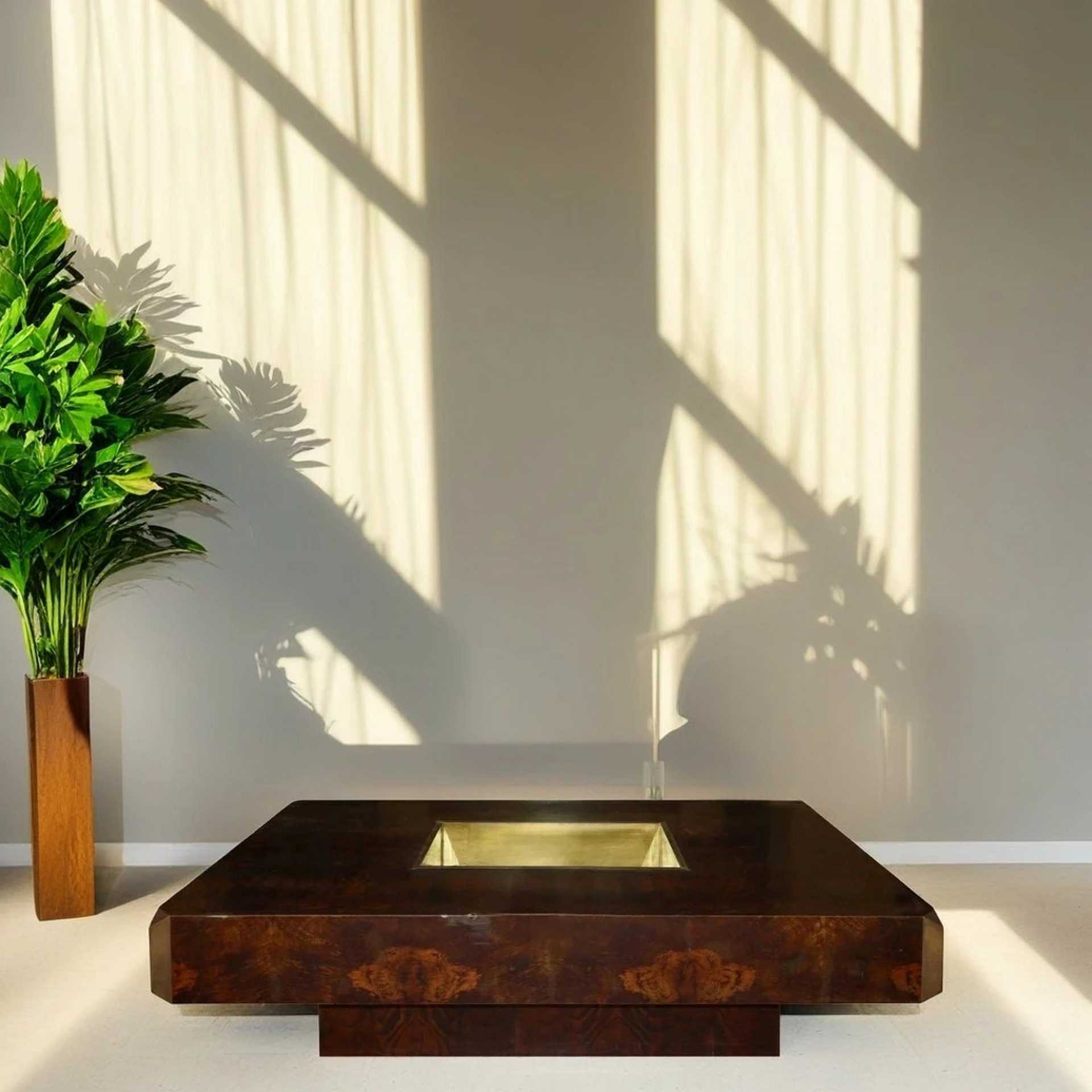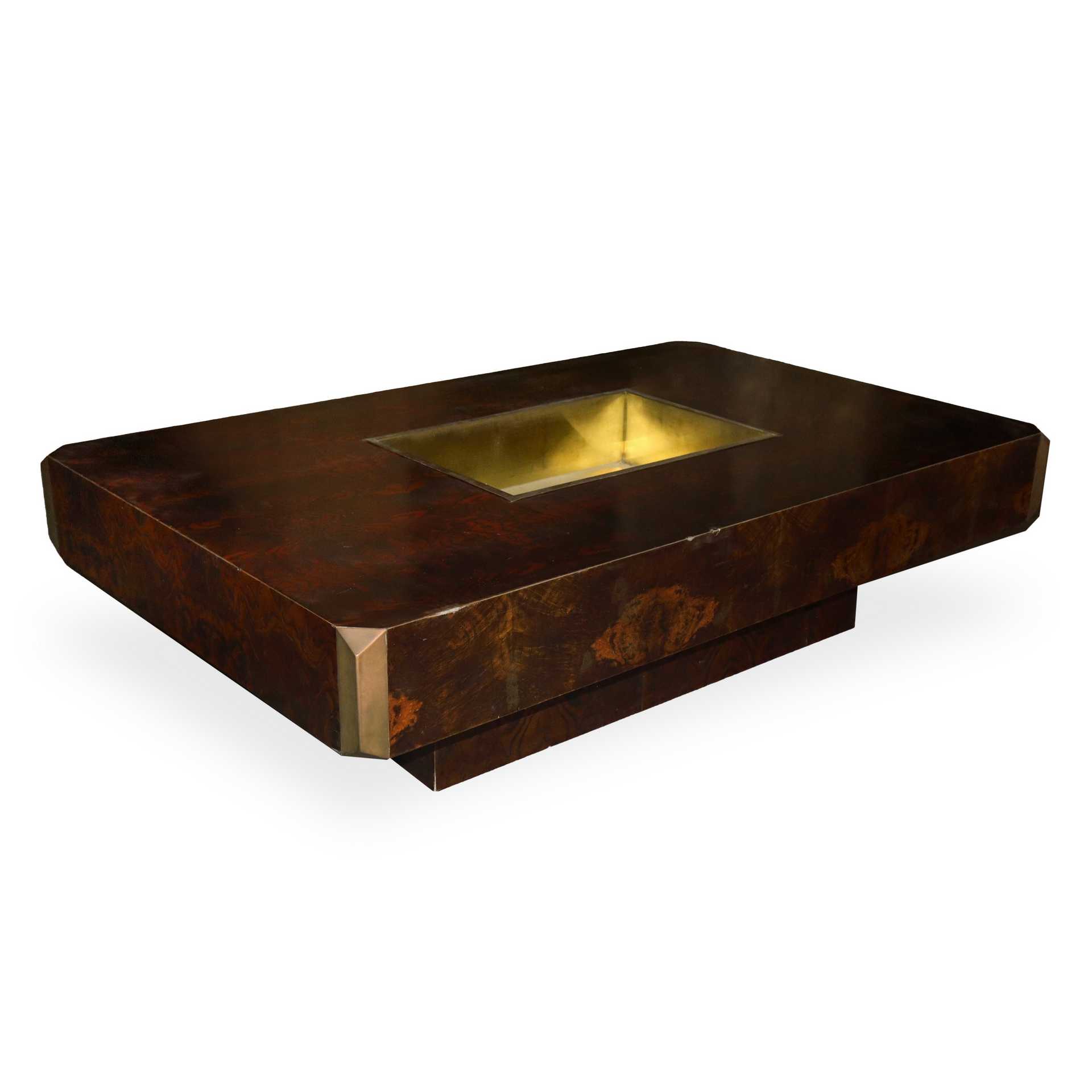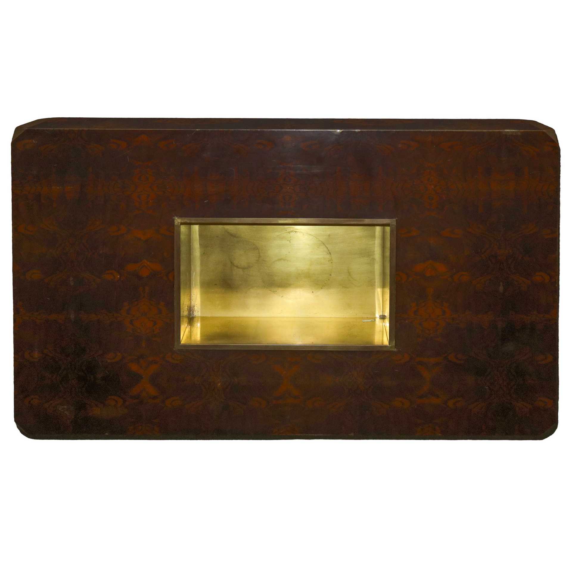 In legno impiallacciato di radica e finiture in ottone. Segni d'uso.