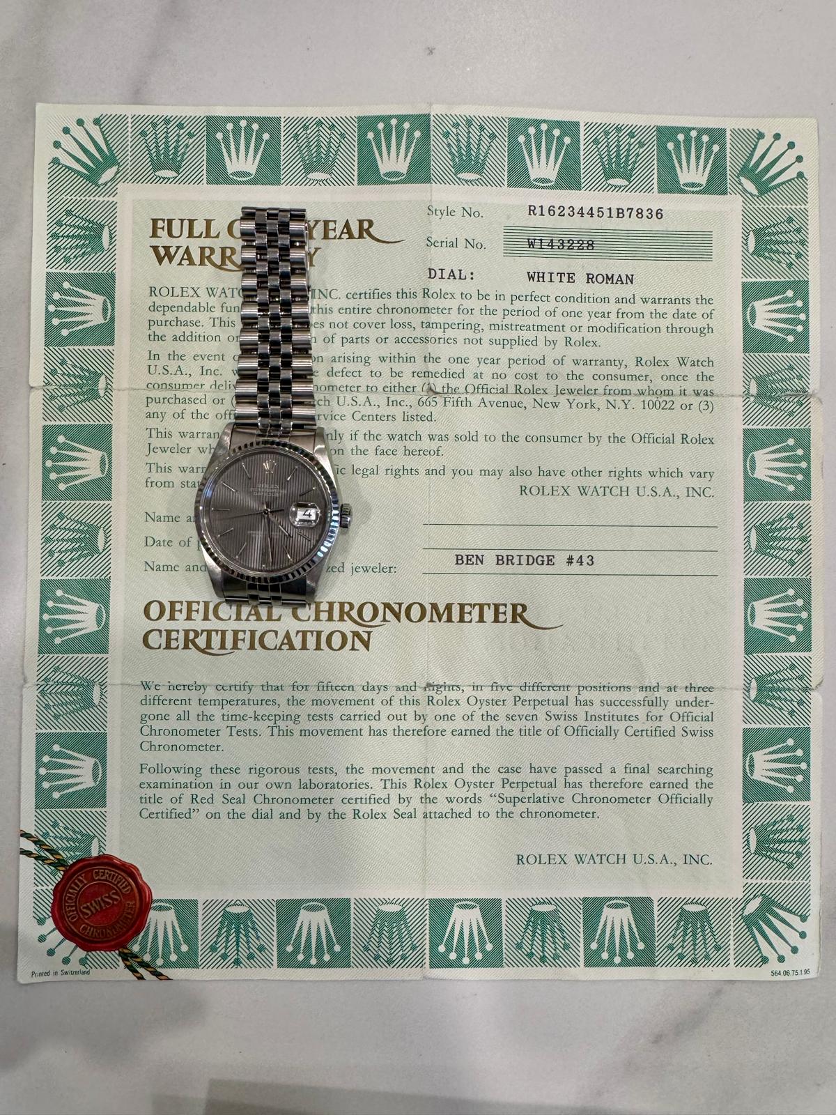 Marca Rolex Modello (Orologio) Datejust 36 Numero di referenza 16234 Carica Automatico Materiale della cassa Acciaio Materiale cinturino Acciaio Anno di produzione 1995 Condizione Ottimo (di seconda mano, segni di usura assenti o appena visibili) documenti originali, no box Carica Automatico Materiale della cassa Acciaio Diametro 36 mm Impermeabile 10 ATM Materiale lunetta Oro bianco Vetro Vetro zaffiro Cinturino Materiale cinturino Acciaio Colore cinturino Acciaio Chiusura Déployante Materiale chiusura Acciaio