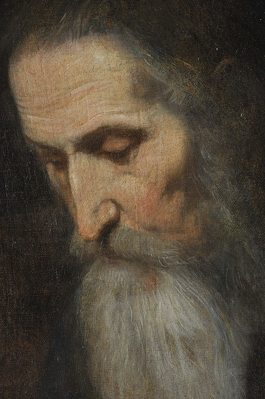 Il dipinto è stato restaurato, con pulizia e rintelo, da Donatella Zari e Carlo Giantomassi. I restauri hanno messo in evidenza una testa di fanciulla, a fianco al volto di anziano, parzialmente resecata, e permesso di comprendere come la tela facesse parte di un quadro di grandi dimensioni, probabilmente per arredo di un ambiente sacro.