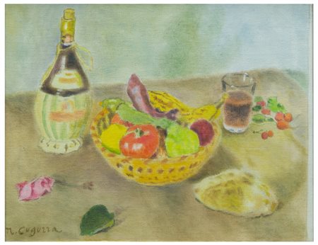 Nazzareno Cugurra (1924) Fiaschetto e bicchiere con vino rosso / Cestino con frutta e verdura / Ravanelli, visciole, pane casareccio / Rosa appassita, foglia di Rosa, 1987