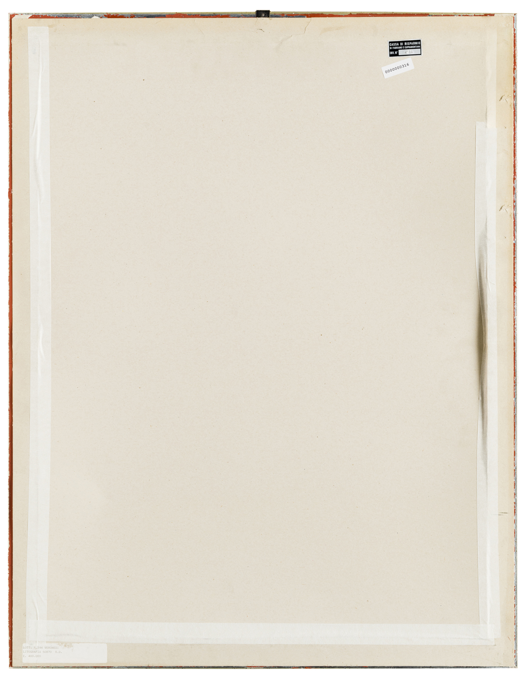 Elementi distintivi: sul verso, una etichetta anonima con dati dell’opera; etichetta della Cassa di Risparmio di Fabriano e Cupramontana con riferimenti di inventario