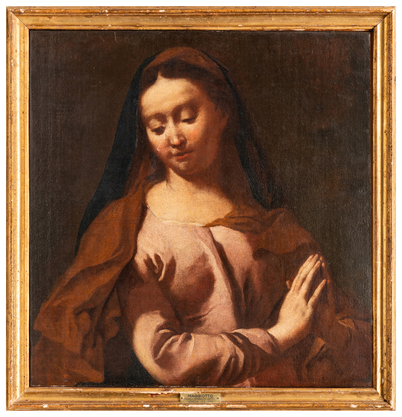 Il merito della attribuzione va a Roldofo Pallucchini, che la propone in una perizia oggi perduta ma ricordata nel catalogo d'asta Semenzato (2011). La proposta è ritenuta pertinente da Giuseppe Pavanello (comunicazione del 25 novembre 2021) e da Marco Horak, che all'opera ha dedicato una importante scheda critica. Come sottolinea Horak «la formazione del Maggiotto avvenne nell’ambito della bottega di Giovanni Battista Piazzetta dove entrò giovanissimo, all’età di soli 10 anni, e dove si distinse come uno degli allievi dotati di maggior talento. È possibile disegnare la parabola artistica del Maggiotto suddividendola in tre diversi periodi che hanno contraddistinto la sua produzione: una prima lunga fase, fino al 1755, in cui le sue opere si basavano quasi completamente sui dettami stilistici del suo maestro Giovanni Battista Piazzetta, una seconda fase in cui Maggiotto si indirizzò verso soluzioni cromatiche molto più varie, ampliando il proprio bagaglio artistico in virtù delle esperienze che gli derivavano dall’avvicinamento a Giambattista Tiepolo (nell’ambito dell’Accademia veneziana di pittura e scultura, presieduta dal Tiepolo), infine il periodo della vecchiaia di Maggiotto, dopo il 1765, in cui il pittore si riavvicina ai modelli giovanili e quindi alle opere del suo maestro Giovanni Battista Piazzetta. Queste considerazioni ci spiegano le ragioni per cui la figura artistica del Maggiotto è stata relegata in passato al mero ruolo di promettente scolaro del Piazzetta e le sue opere frequentemente confuse con quelle del suo mentore. Solo in tempi relativamente recenti e a partire dall'esame di poche sue opere firmate, o comunque basate su fonti documentarie, si è giunti alla formulazione di un catalogo formato da una cinquantina di dipinti di autografia certa, la cui corretta attribuzione è stata pure corroborata dal confronto con incisioni di derivazione. Ed è stato proprio attraverso questo lavoro di ricerca e approfondimento che si è giunti, per merito del già citato Rodolfo Pallucchini, ad assegnare correttamente la pregevole Madonna in preghiera in esame alla mano di Domenico Fedeli detto il Maggiotto. L’opera, pienamente fedele al chiaroscuro piazzettesco dalle tonalità bruno-rossastre, è a mio parere collocabile entro il 1750 e si caratterizza per il rigore di un meccanismo compositivo essenziale, che tende ad enfatizzare l’atteggiamento di sereno misticismo della Vergine, in cui spicca una grande e raffinata delicatezza nelle forme, accompagnate dal già citato forte contrasto in chiaroscuro che, in virtù dell’orientamento della luce spiovente dall’alto conferisce risalto agli incarnati, nei quali si apprezzano le ombre e le morbide e delicate sfumature.». La pregevole lettura di Marco Horak segnala nel dipinto anche il testimone di un cambiamento di gusto nella «grande committenza privata veneziana: infatti le grandi composizioni di genere storico e mitologico, fino ad allora testimonianza di fedeltà ai canoni etici stilistici degli illustri antenati, iniziarono a decadere in favore di un gusto più introspettivo, funzionale ad un ruolo dell’arte più orientato all’intimità».