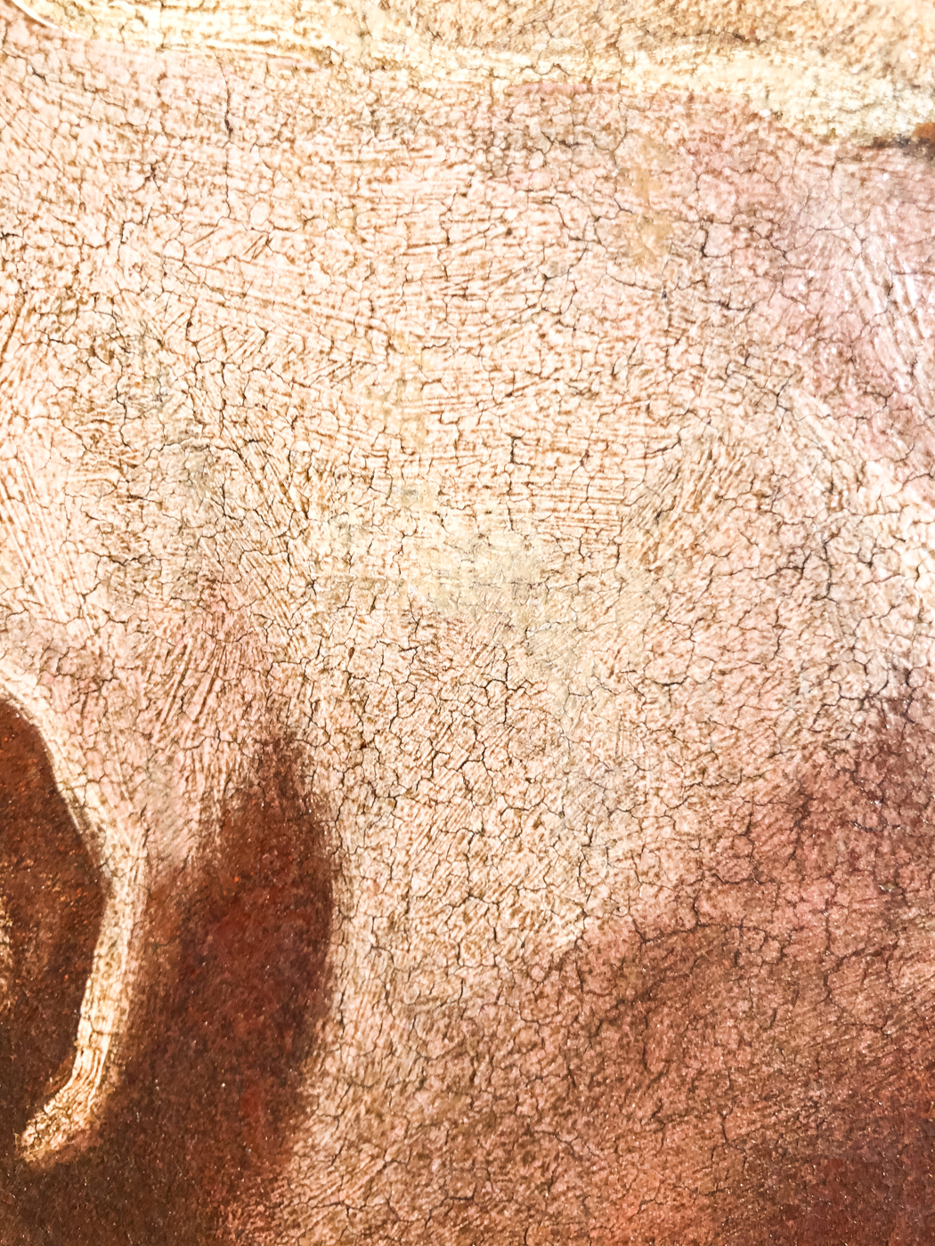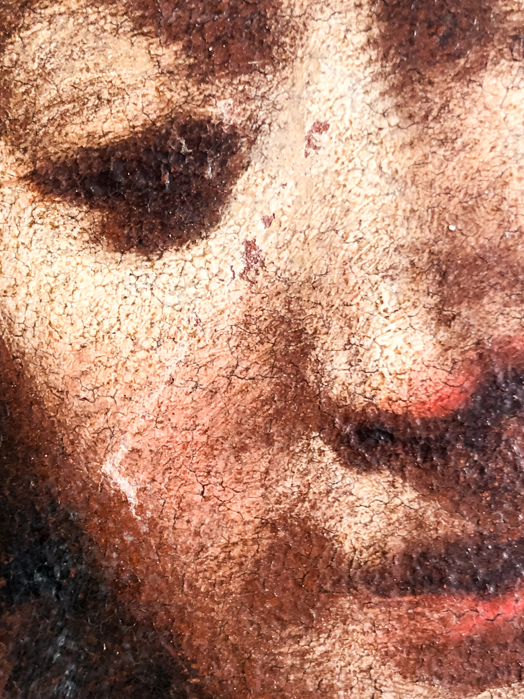 Stato di conservazione. Superficie: 80% (graffi, cadute di colore, riprese pittoriche)