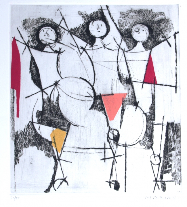 "Senza titolo" puntasecca, acquatinta a 3 colori cm. H: 31.00 L: 29.00 Dalla cartella "La Ribalta", cm. 71x50 (foglio), cm. 31x29 (lastra). Firma in basso a destra, tiratura in basso a sinistra 53/75.