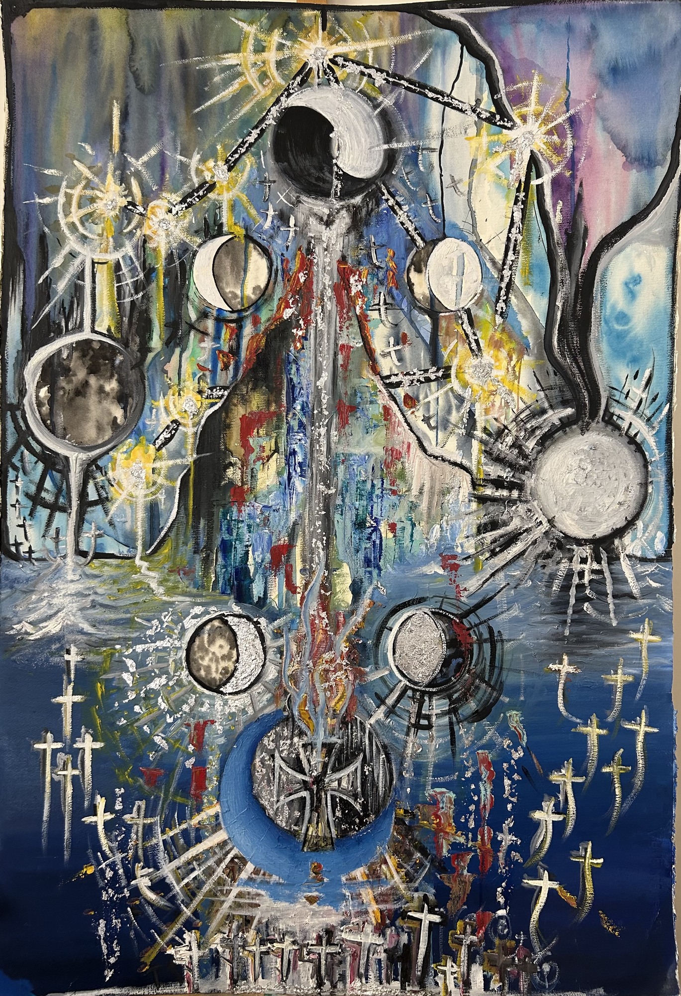 TECNICA: olio, ecoline, acquerello, foglia argento (imitazione)