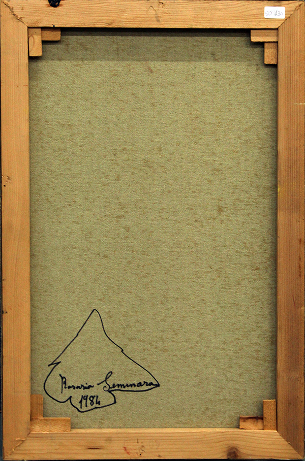 R. SEMINARA "Sciatore sulla neve", 1984, olio su tela, dim 60x40. Al fronte: firma in basso a destra. Al verso: firma e anno in basso a sinistra.