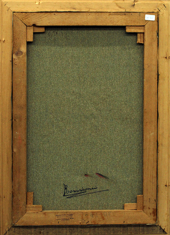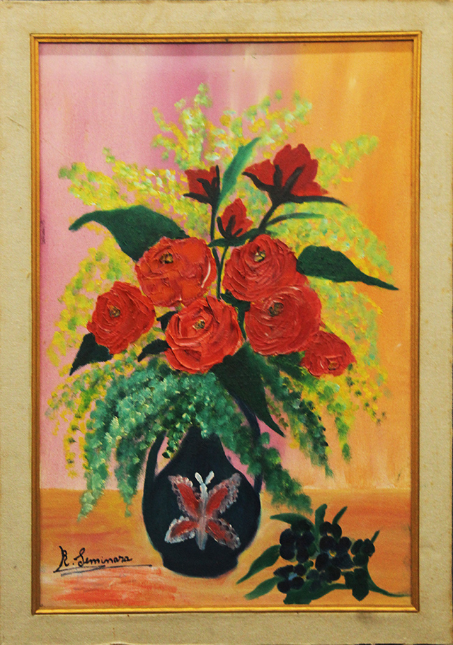 R. SEMINARA, "Vaso di fiori", anni '70, olio su tela, dim 60x40 cm. Al fronte: firma in basso a sinistra. Al verso: dedica a Romeniconi e timbro Galleria D'Arte Il Salotto Livorno. Opera senza cornice con solo il passpartout.