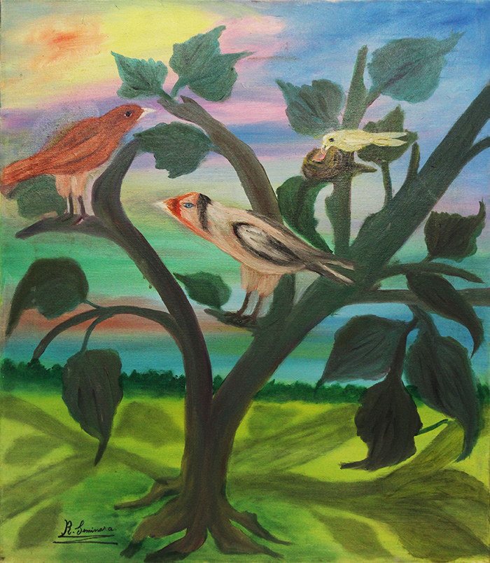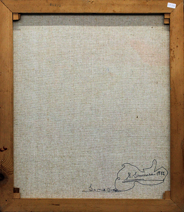 R. SEMINARA "La mie fantasie", 1982, olio su tela, dim 70x60. Al fronte: firma in basso a sinistra. Al verso: firma, titolo, anno in basso a destra.