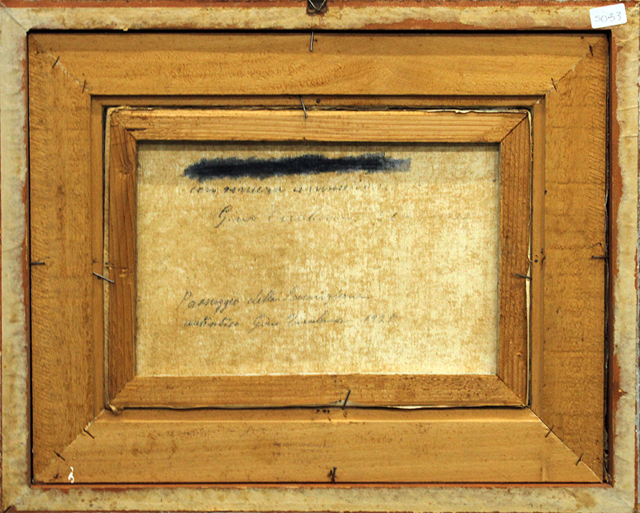 GINO TIRALANA, "Paesaggio della Lunigiana", 1976, olio su tela, dim 23x32 cm. Al fronte: firma e anno in basso a destra. Al verso: firma, titolo, dichiarazione di autenticità da parte dell'artista, firma e anno. Opera con cornice.