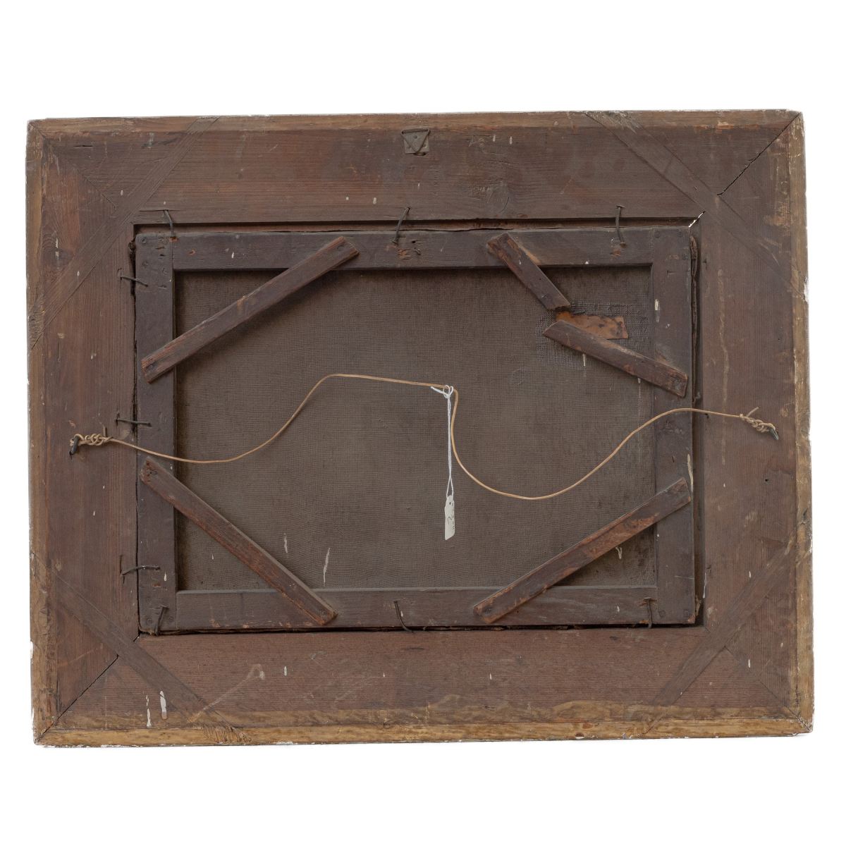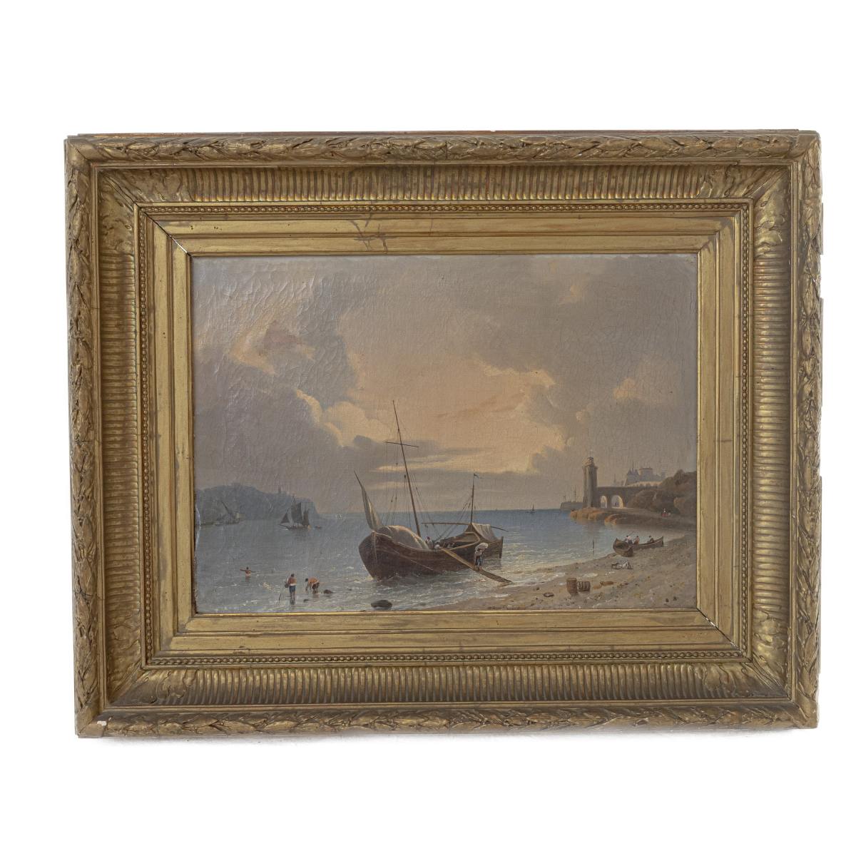 Scorcio di marina con barche, persone e costruzioni fine XIX secolo dipinto olio su tela 33 x 45,5