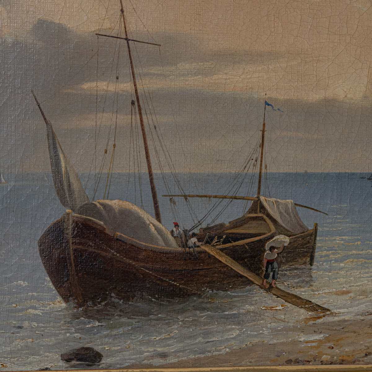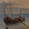 Scorcio di marina con barche, persone e costruzioni fine XIX secolo
