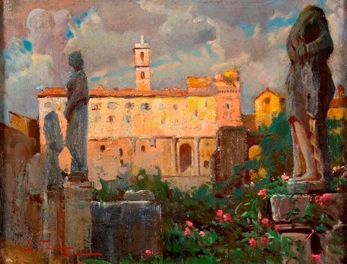 EDOARDO TANI (Tivoli, 1880 - Roma, 1948) Veduta con il Campidoglio 1930 circa Olio su cartone 27 x 35 cm