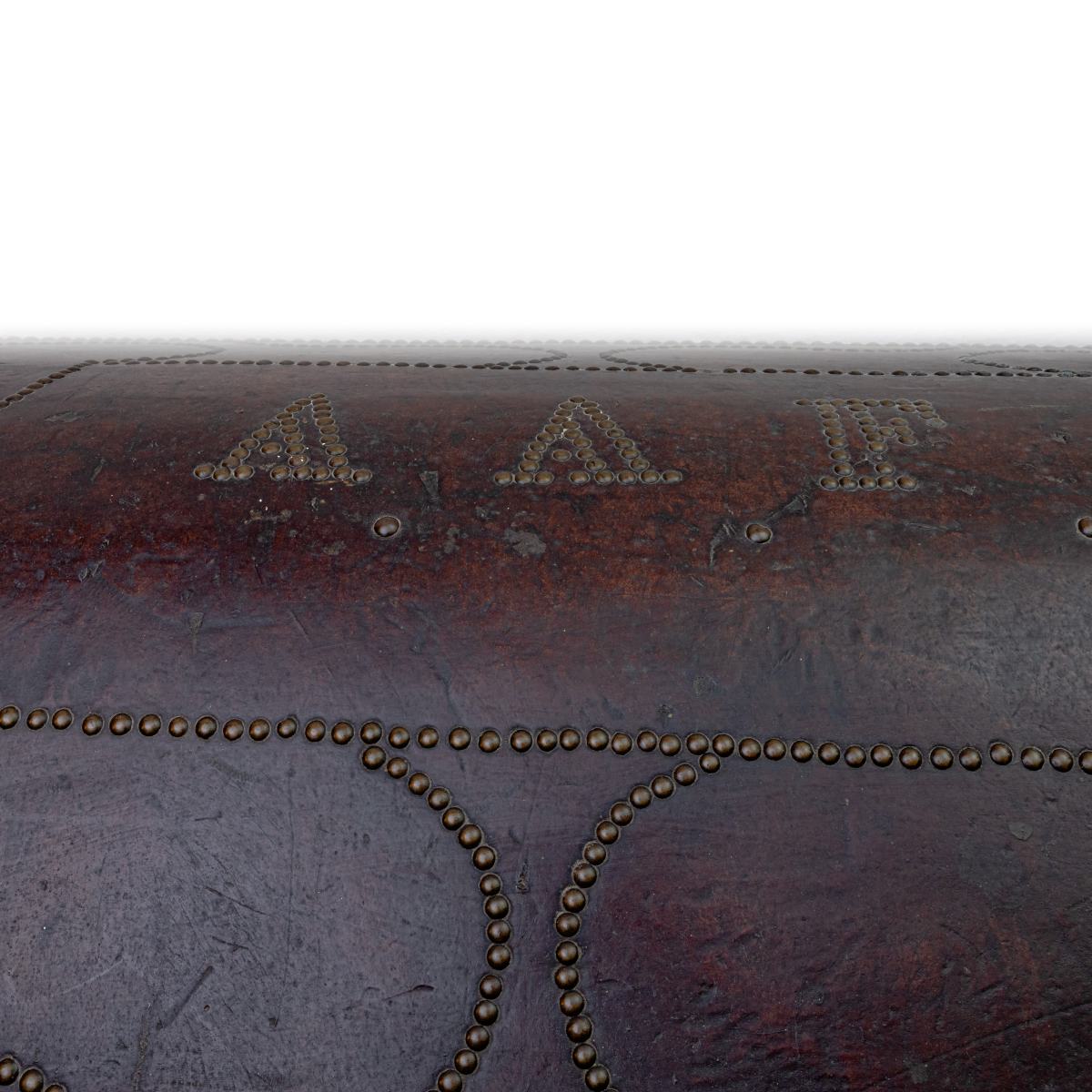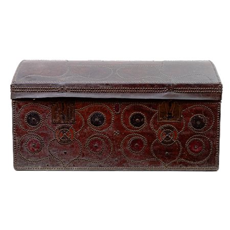 Baule in cuoio e in legno con finiture a borchie di ottone, arte indo/portoghese, inizio XIX secolo