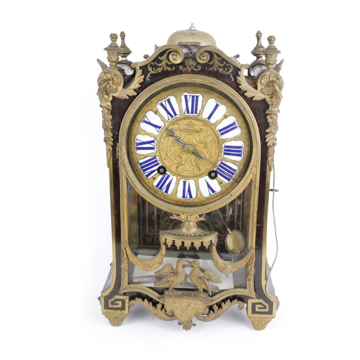 con quadrante circolare in bronzo dorato ed inciso a rilievi floreali, con numeri romani in blu su smalto bianco e numeri arabi sul bordo esterno, presenta due fori per la carica e la suoneria. Movimento con sospensione a filo e regolatore a pendolo ; suoneria a percussione con campana in bronzo, macchina firmata Gite Martinot aparis. Cassa a plinto su quattro piedi tronco conici , con pareti laterali in vetro e legno impiallacciato e filettato in ottone.