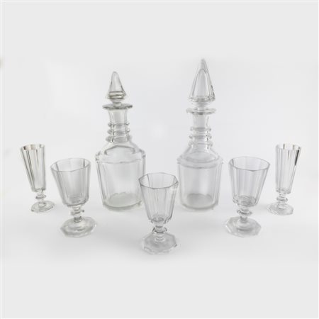 per otto, a forma di calice ottagonale, corpo svasato verso il basso con anello su base. In tre diverse altezze pezzi ventotto più due bottiglie en suite.