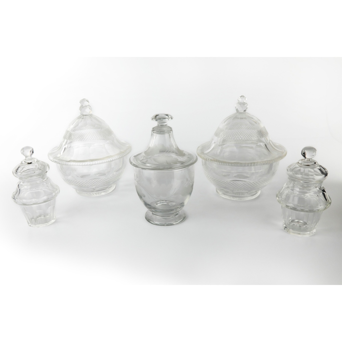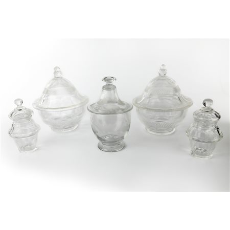Lotto di cinque contenitori in vetro prima metà XX secolo