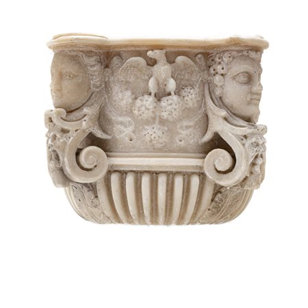 di forma quadrangolare. Con quattro teste mulieri angolari intervallate da sculture di teste di angeli con motivi floreali. Base del corpo costolata.