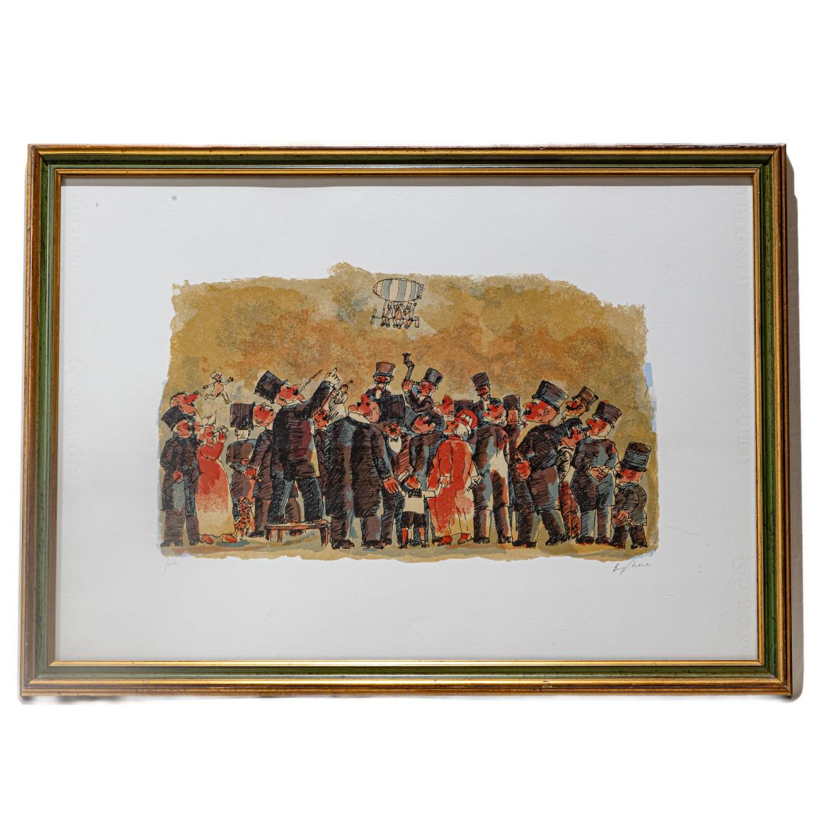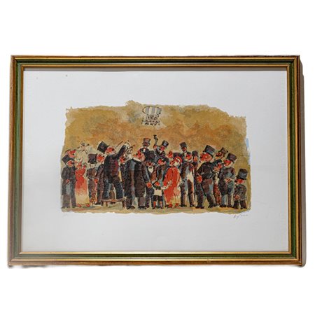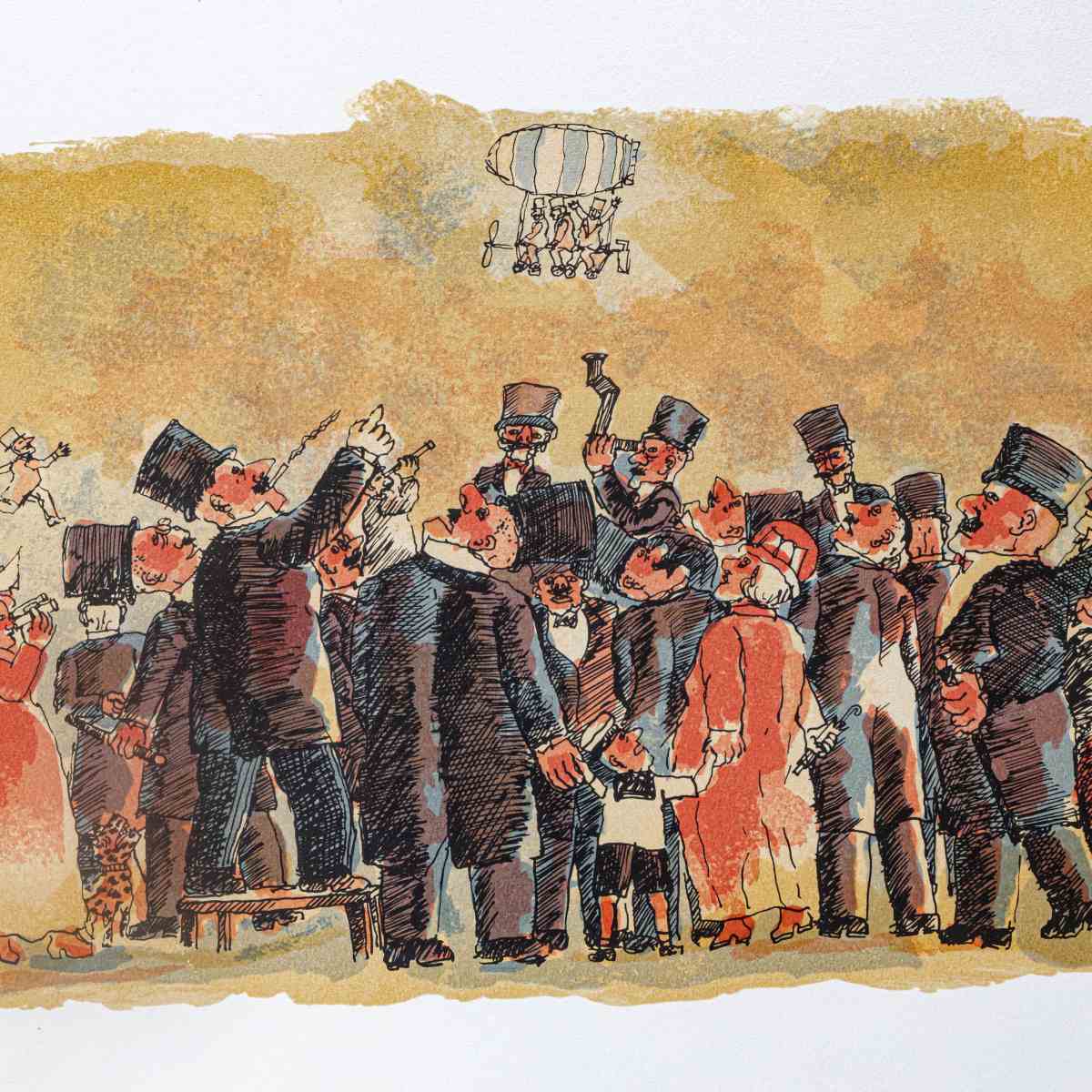 FRANZ BORGHESE (Roma, 1941 - 2005) Folla con dirigibile, multiplo su carta 50 x 70 cm