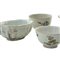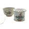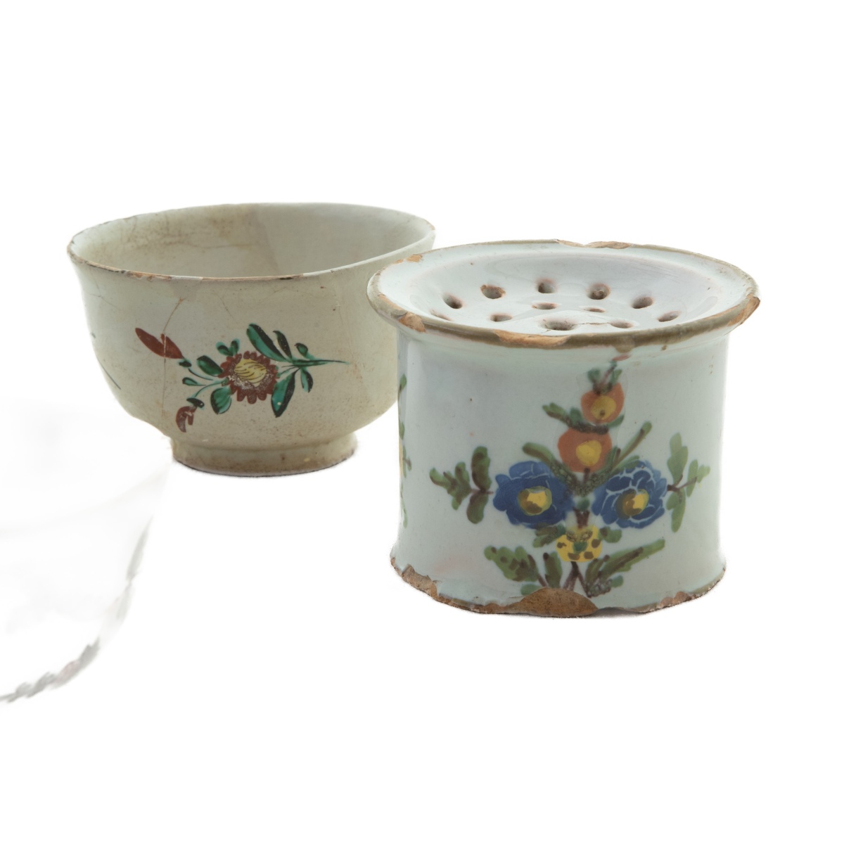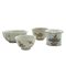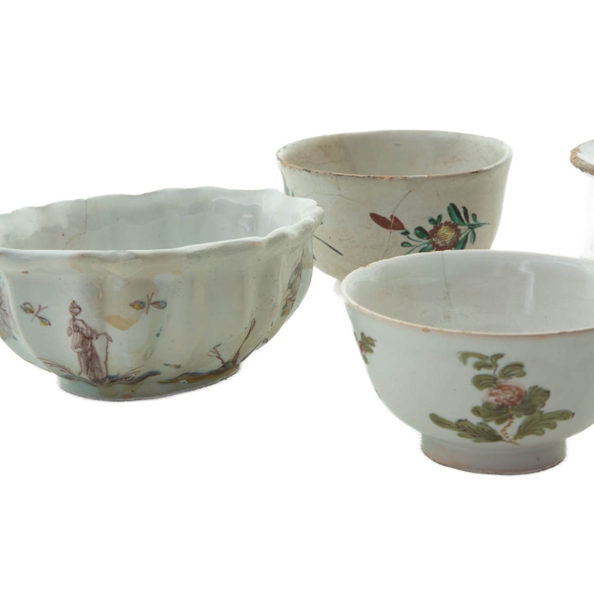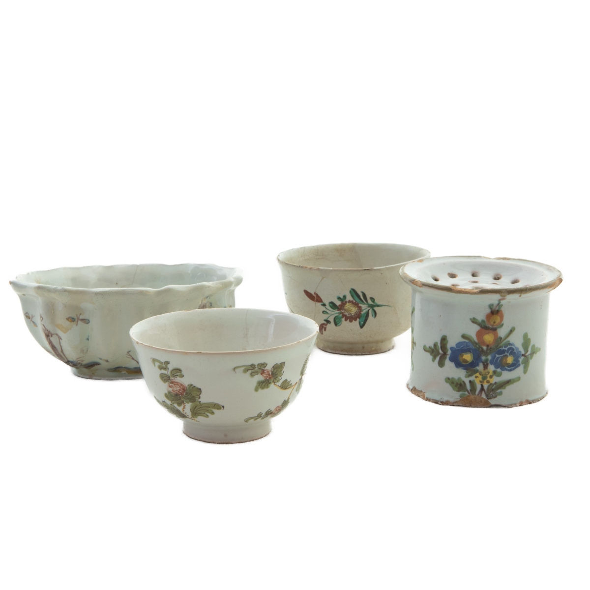 una vaschetta dal corpo costolato con scene di paesaggio e personaggi 11 x 9 x 4,5 cm; portafiori cilindrico con decoro a fiori su fondo azzurro 5 ,7 x 6,2 cm; tazza a campana con decoro floreale a fiori di patata su fondo bianco 7,8 x 4,3 cm. Manifatture della Liguria e dell'Emilia Romagna. la quarta ceramica è una tazza da caffè a campana con decoro " alla rosa" al piccolo fuoco su fondo bianco siglata alla base Ferniani, Faenza, ultimo quarto del XVIII secolo 8 x 5 cm.