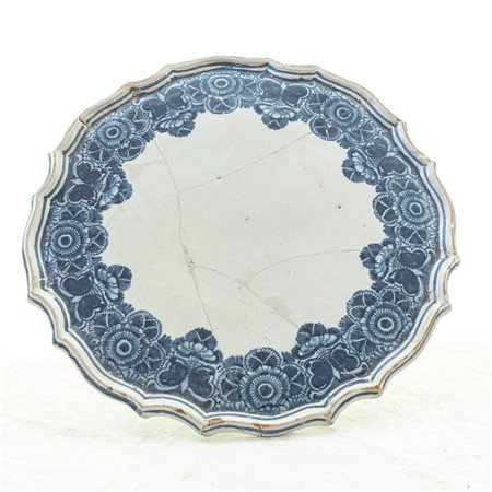 con orlo del piatto a sedici punte mistilineo e rialzato all'esterno, piede svasato verso il basso e corpo costolato. Decoro sul piatto " all' olandese" con fascia ad elementi vegetali in blu cobalto su fondo bianco. Manifattura Ferniani ,Faenza, metà XVIII secolo