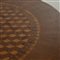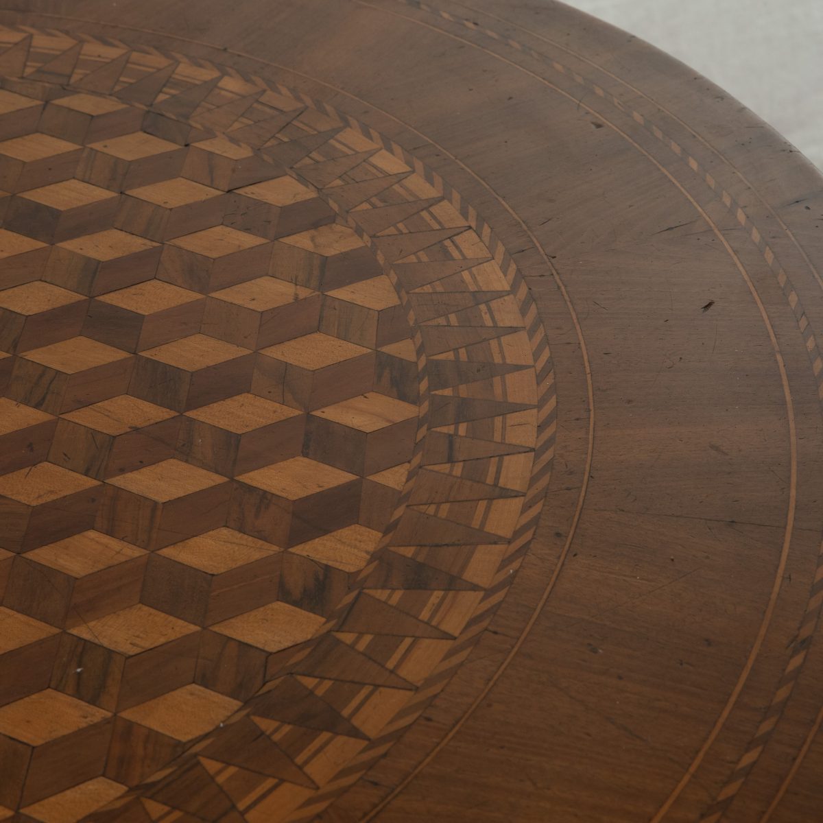 77 x 72 cm con piano circolare e gambo al tornio su tre piedi da appoggio. Finiture a tarsie geometriche su piano, gambo e piedi