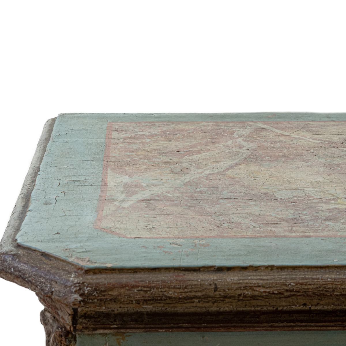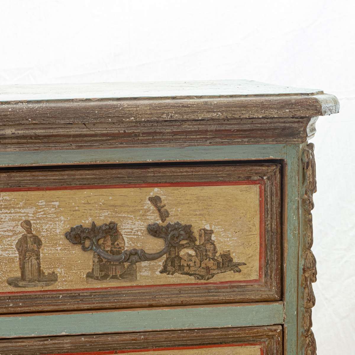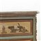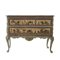 a due cassetti di forma rettangolare con quattro gambe a virgola, laccato con scene di invenzione ed elementi fitomorfi. Parti intagliate a motivi vegetali