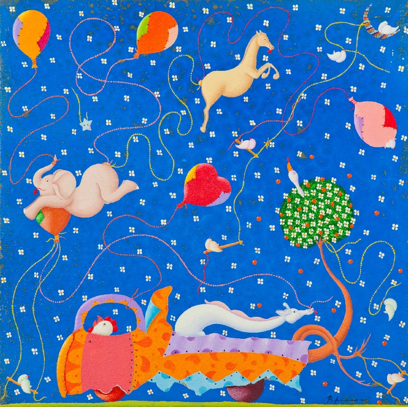 Beppe Francesconi (Marina di Massa (Ms) 1961) PER OGNI VOLTA CHE HAI PENSATO DI FARLO Olio su tela, cm. 50x50 Firmato in basso a destra. Sul verso: firma e titolo.