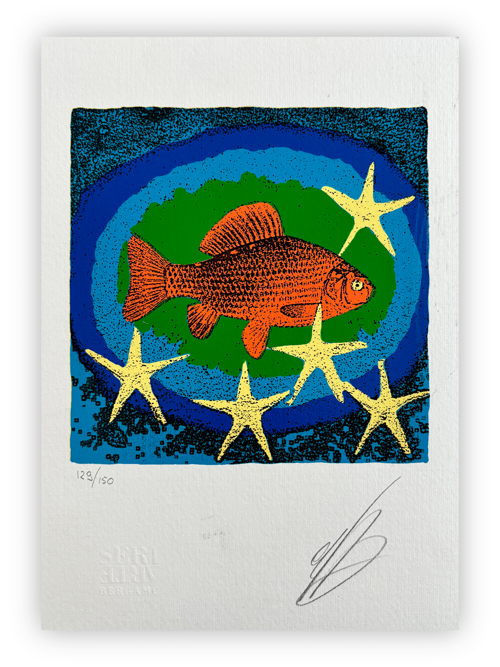 Firma e numerazione (Esemplare 129/150) a matita al fronte
