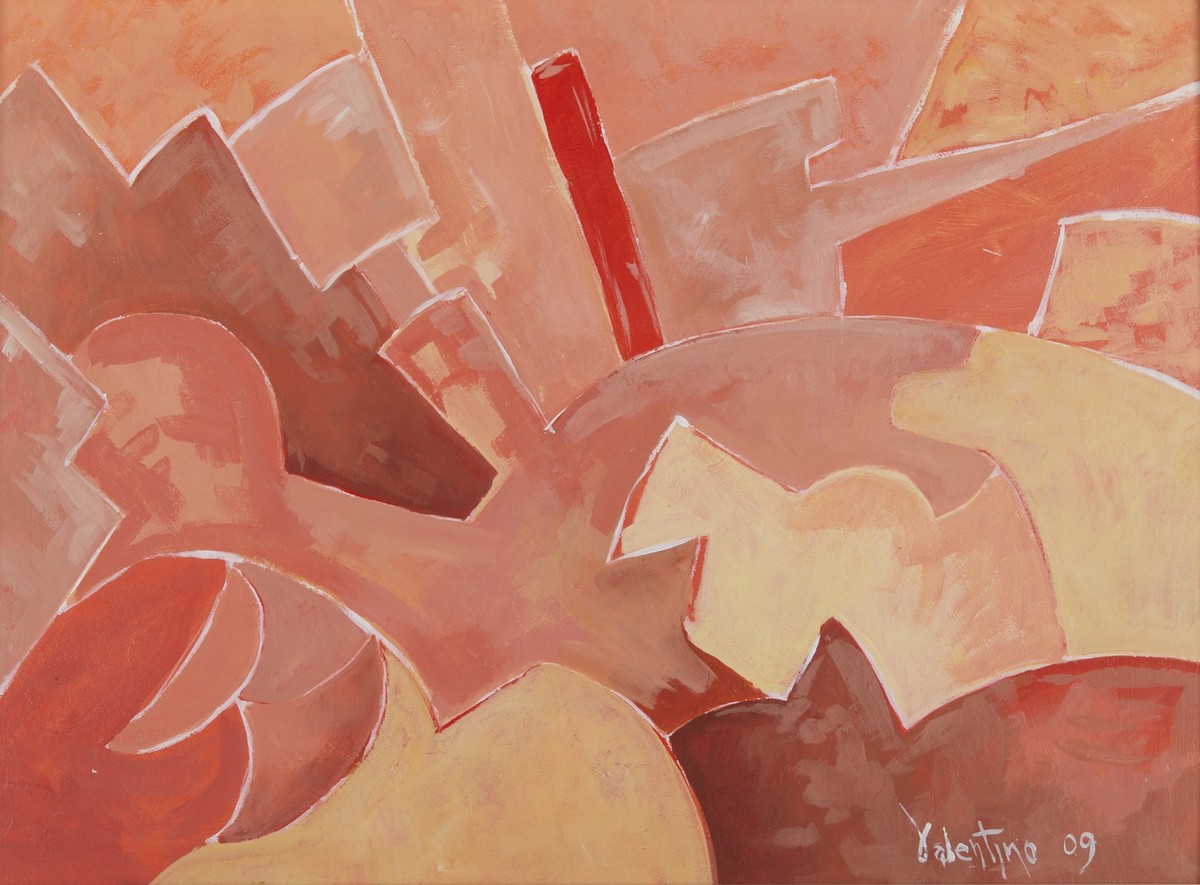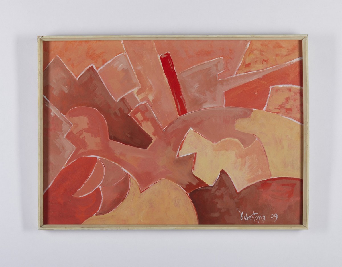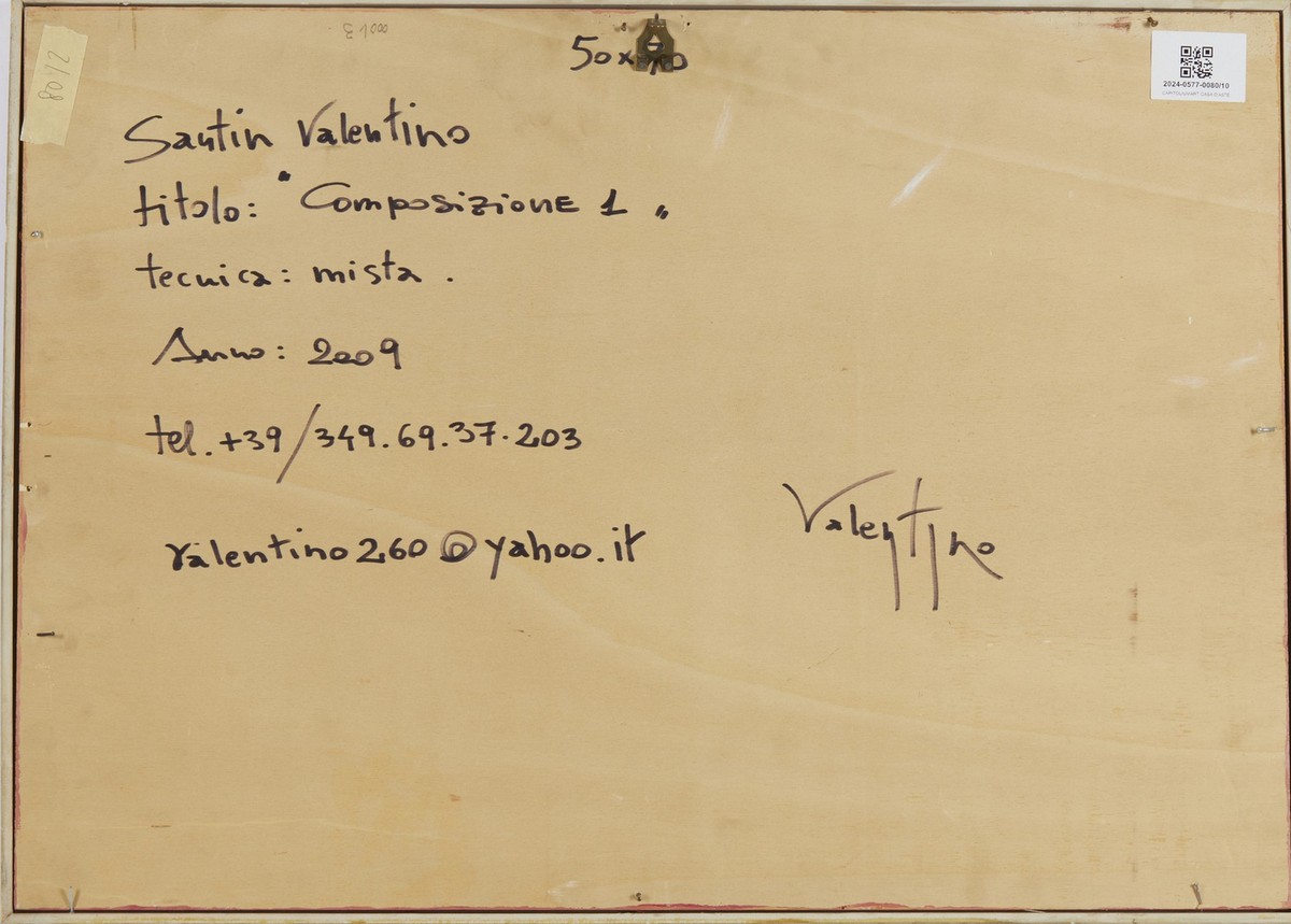 - Santin Valentino, Composizione 1, 2009, tecnica mista su tavola, firma, data, sul retro: firma, titolo, data, 50x70cm. Cornice presente