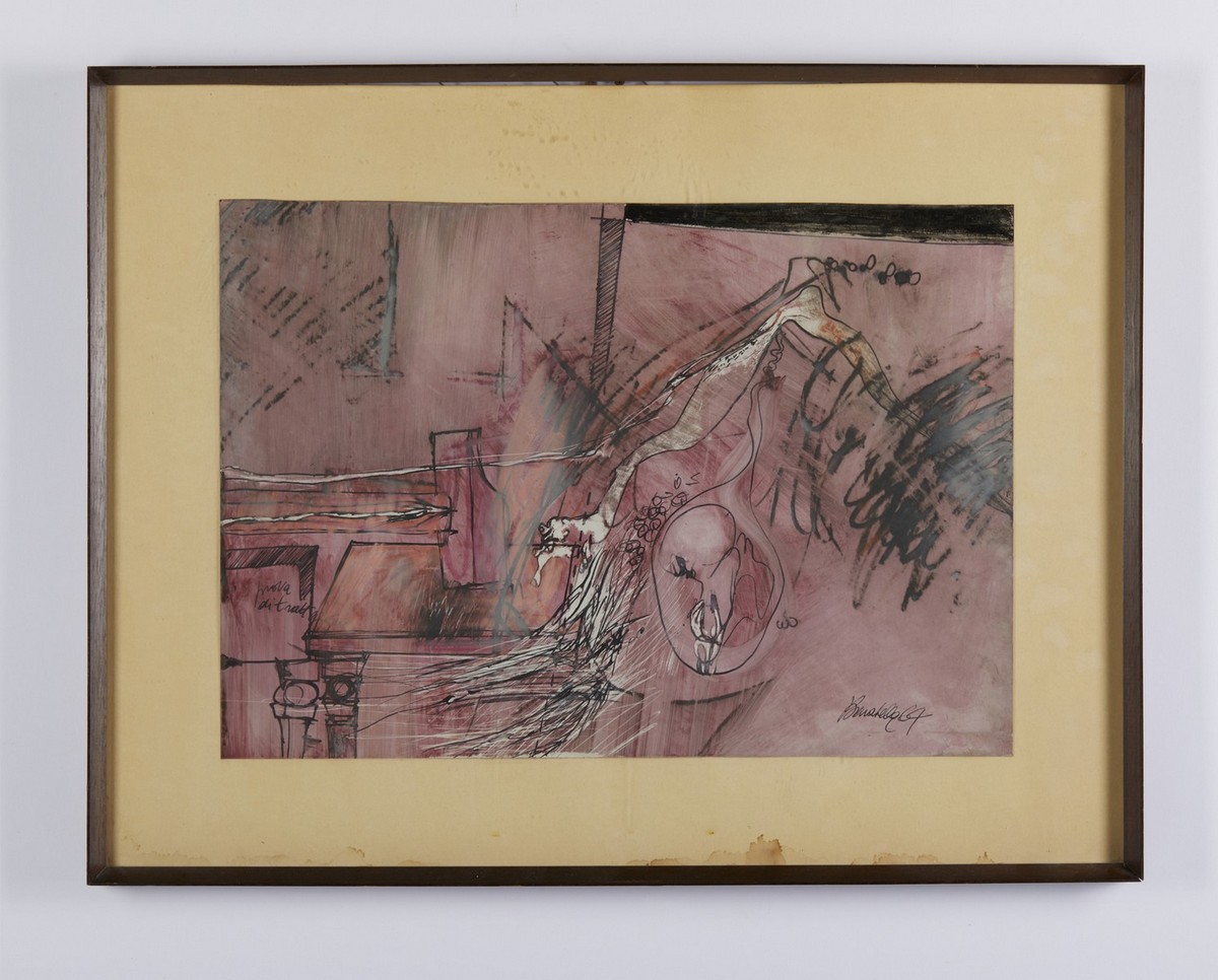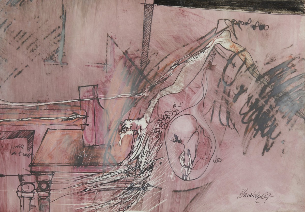 - PELLICANÒ, PROVA DI TRATTEGGIO,1964, firma, data, titolo, 50x35cm tecnica mista su carta. Cornice presente