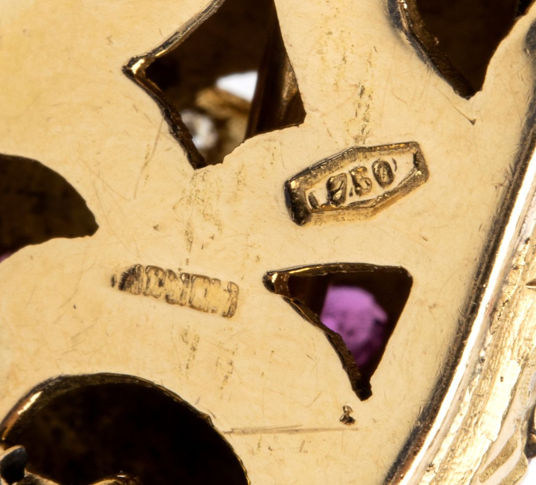 Diametro lapislazzuli: circa 10 mm. Punzonato "750 e firma poco leggibile, forse di Filippo Moroni". Diametri interni: 6 x 5,2 cm. Peso 46 gr.